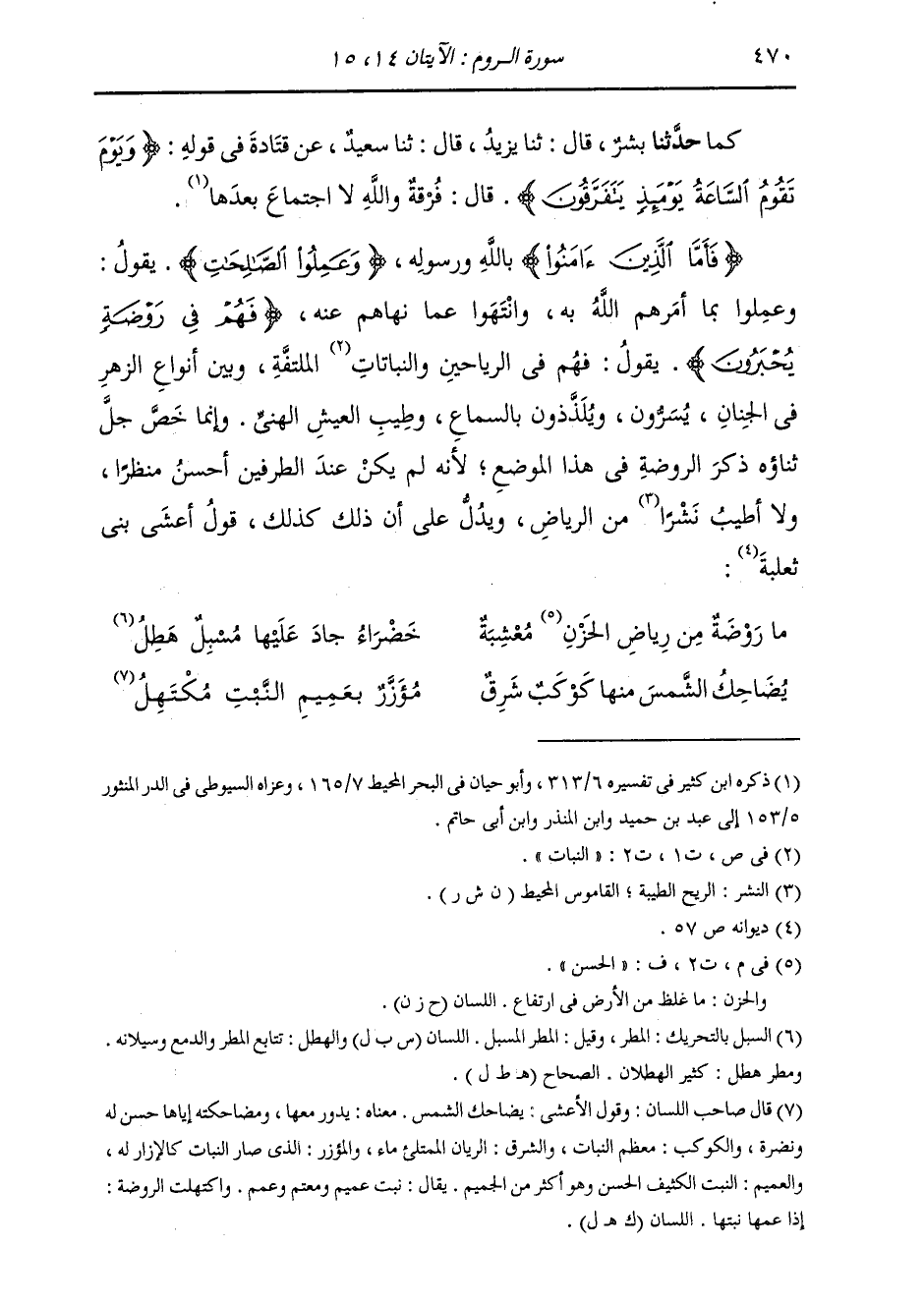 كَمَا: حَدَّثَنَا بِشْرٌ، قَالَ: ثنا يَزِيدُ، قَالَ: ثنا سَعِيدٌ، عَنْ قَتَادَةَ، فِي قَوْلِهِ: " {§يَوْمَ تَقُومُ السَّاعَةُ يَوْمَئِذٍ يَتَفَرَّقُونَ} [الروم: 14] قَالَ: فُرْقَةٌ وَاللَّهِ لَا اجْتِمَاعَ بَعْدَهَا " {فَأَمَّا الَّذِينَ آمَنُوا} [الروم: 15] بِاللَّهِ وَرَسُولِهِ. {وَعَمِلُوا الصَّالِحَاتِ} [الروم: 15] يَقُولُ: وَعَمِلُوا بِمَا أَمَرَهُمُ اللَّهُ بِهِ، وَانْتَهَوْا عَمَّا نَهَاهُمْ عَنْهُ. {فَهُمْ فِي رَوْضَةٍ يُحْبَرُونَ} [الروم: 15] يَقُولُ: فَهُمْ فِي الرَّيَاحِينِ وَالنَّبَاتَاتِ الْمُلْتَفَّةِ، وَبَيْنَ أَنْوَاعِ الزَّهْرِ فِي الْجِنَّانِ يُسَرُّونَ، وَيَلَذْذُونَ بِالسَّمَاعِ وَطِيبِ الْعَيْشِ الْهَنِيِّ. وَإِنَّمَا خَصَّ جَلَّ ثَنَاؤُهُ ذِكْرَ الرَّوْضَةِ فِي هَذَا الْمَوْضِعِ، لِأَنَّهُ لَمْ يَكُنْ عِنْدَ الطَّرَفَيْنِ أَحْسَنُ مَنْظَرًا، وَلَا أَطْيَبُ نُشُرًا مِنَ الرِّيَاضِ، وَيَدُلُّ عَلَى أَنَّ ذَلِكَ كَذَلِكَ قَوْلُ أَعْشَى بَنِي ثَعْلَبَةَ: