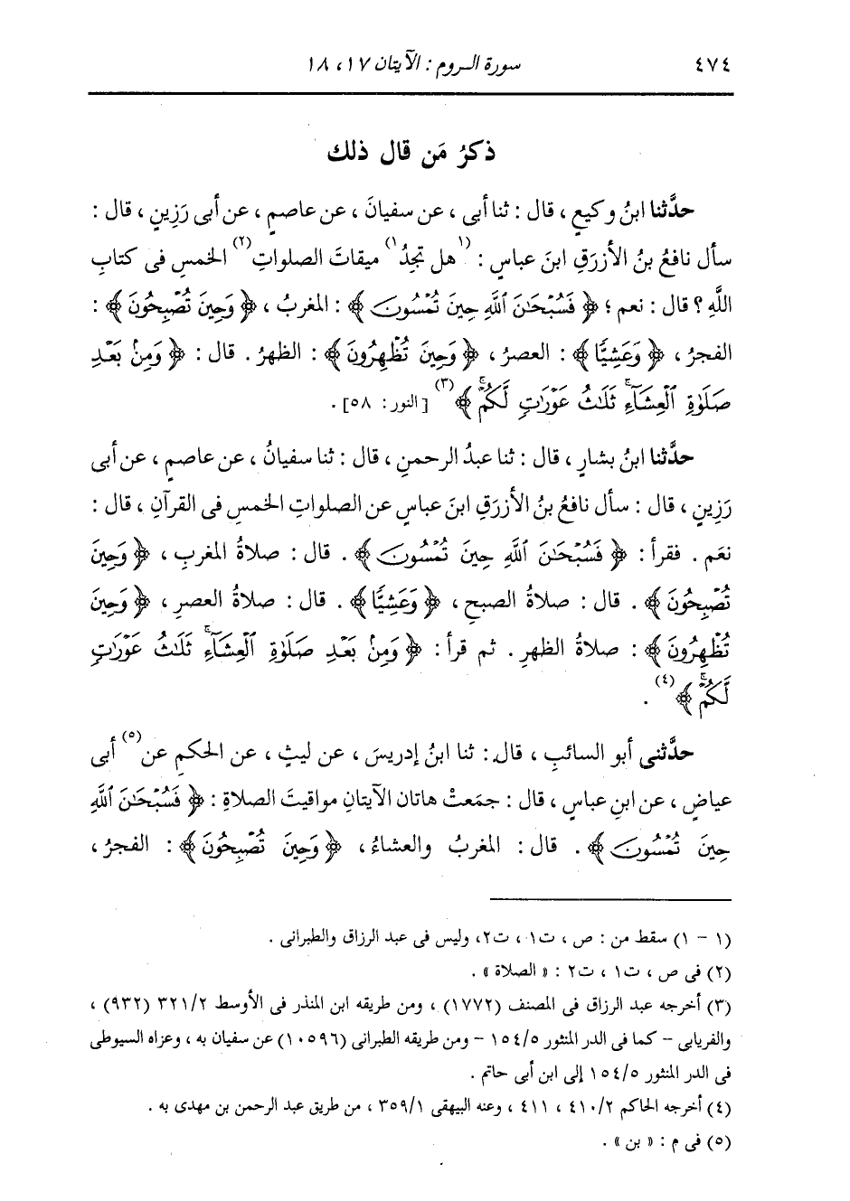حَدَّثَنَا ابْنُ بَشَّارٍ، قَالَ: ثنا عَبْدُ الرَّحْمَنِ، قَالَ: ثنا سُفْيَانُ، عَنْ عَاصِمٍ، عَنْ أَبِي رَزِينٍ، قَالَ: سَأَلَ نَافِعُ بْنُ الْأَزْرَقِ ابْنَ عَبَّاسٍ عَنِ الصَّلَوَاتِ الْخَمْسِ، فِي الْقُرْآنِ، قَالَ: نَعَمْ، فَقَرَأَ {§فَسُبْحَانَ اللَّهِ حِينَ تُمْسُونَ} [الروم: 17] قَالَ: صَلَاةُ الْمَغْرِبِ {وَحِينَ تُصْبِحُونَ} [الروم: 17] قَالَ: صَلَاةُ الصُّبْحِ {وَعَشِيًّا} [مريم: 11] قَالَ: صَلَاةُ الْعَصْرِ {وَحِينَ تُظْهِرُونَ} [الروم: 18] صَلَاةُ الظُّهْرِ، ثُمَّ قَرَأَ: {وَمِنْ بَعْدِ صَلَاةِ الْعِشَاءِ ثَلَاثُ عَوْرَاتٍ لَكُمْ} [النور: 58] "