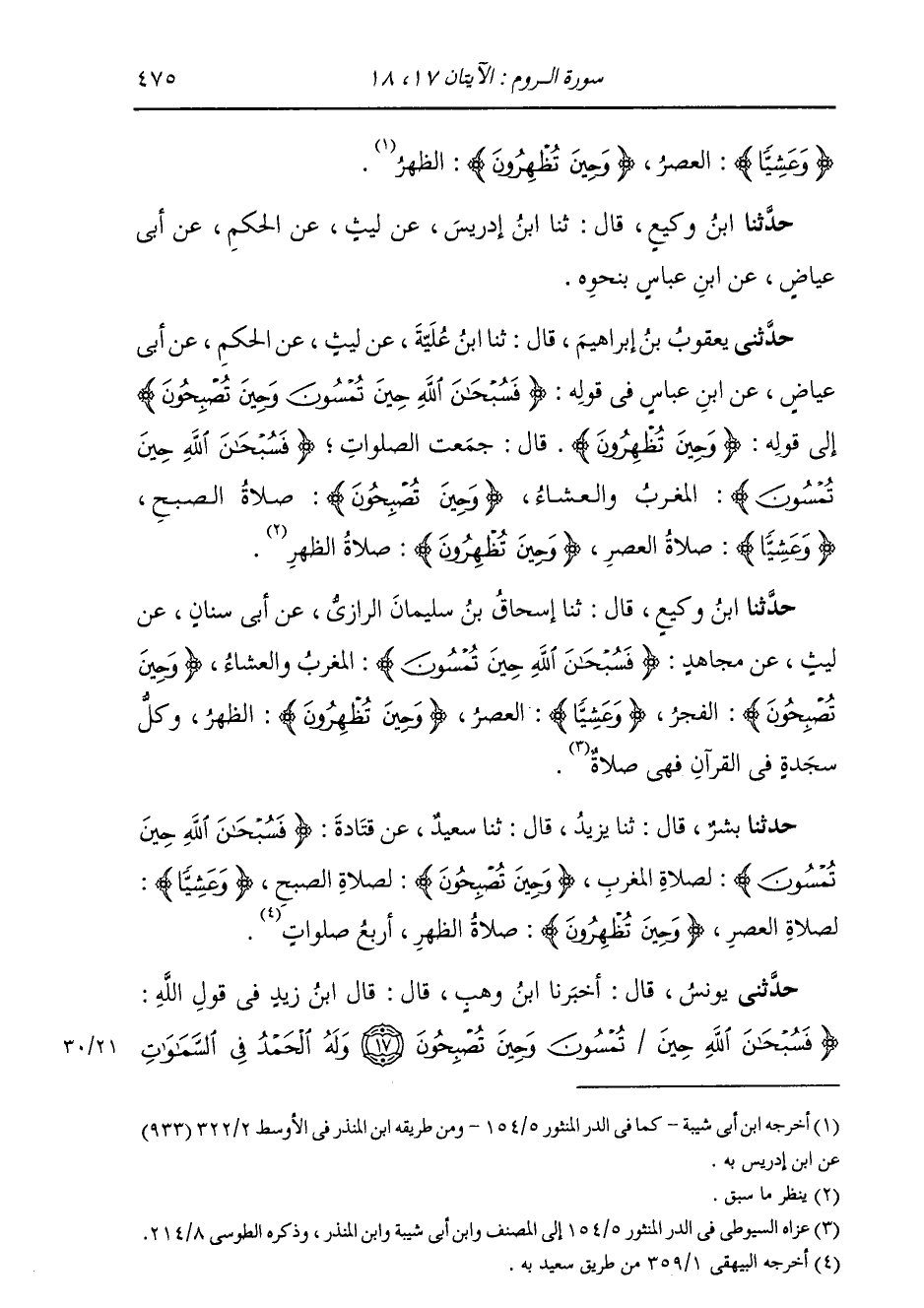 حَدَّثَنِي يَعْقُوبُ بْنُ إِبْرَاهِيمَ، قَالَ: ثنا ابْنُ عُلَيَّةَ، عَنْ لَيْثٍ، عَنِ الْحَكَمِ، عَنْ أَبِي عِيَاضٍ، عَنِ ابْنِ عَبَّاسٍ فِي قَوْلِهِ: " {§فَسُبْحَانَ اللَّهِ حِينَ تُمْسُونَ وَحِينَ تُصْبِحُونَ} [الروم: 17] إِلَى قَوْلِهِ: {وَحِينَ تُظْهِرُونَ} [الروم: 18] قَالَ: جَمَعَتِ الصَّلَوَاتِ، {فَسُبْحَانَ اللَّهِ حِينَ تُمْسُونَ} [الروم: 17] الْمَغْرِبُ وَالْعِشَاءُ {وَحِينَ تُصْبِحُونَ} [الروم: 17] صَلَاةُ الصُّبْحِ {وَعَشِيًّا} [مريم: 11] صَلَاةُ الْعَصْرِ {وَحِينَ تُظْهِرُونَ} [الروم: 18] صَلَاةُ الظُّهْرِ "