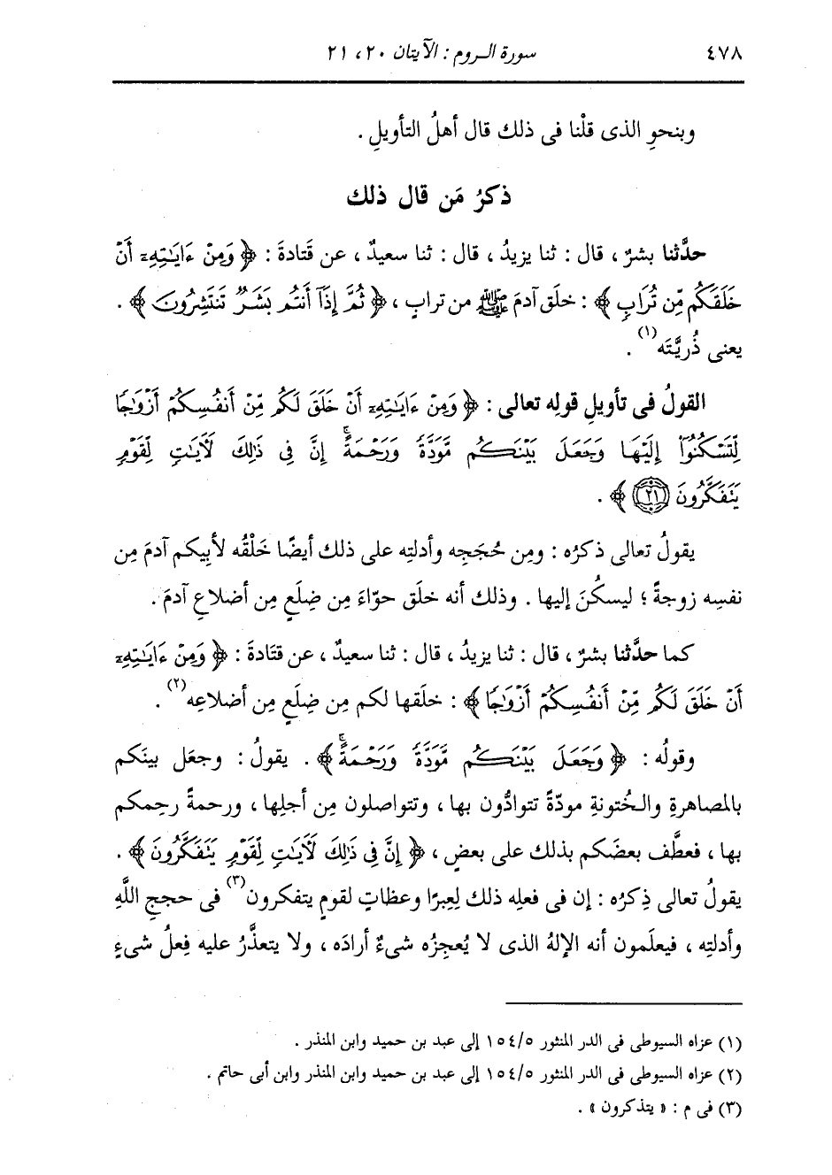 §وَقَوْلُهُ: {وَجَعَلَ بَيْنَكُمْ مَوَدَّةً وَرَحْمَةً} [الروم: 21] يَقُولُ: جَعَلَ بَيْنَكُمْ بِالْمُصَاهَرَةِ وَالْخُتُونَةِ مَوَدَّةً تَتَوَادُّونَ بِهَا، وَتَتَوَاصَلُونَ مِنْ أَجْلِهَا، وَرَحْمَةً رَحِمَكُمْ بِهَا، فَعَطَفَ بَعْضُكُمْ بِذَلِكَ عَلَى بَعْضٍ {إِنَّ فِي ذَلِكَ لَآيَاتٍ لِقَوْمٍ يَتَفَكَّرُونَ} [الرعد: 3] يَقُولُ تَعَالَى ذِكْرُهُ: إِنَّ فِي فِعْلِهِ ذَلِكَ لَعِبَرًا وَعِظَاتٍ لِقَوْمٍ يَتَذَكَّرُونَ فِي حِجَجِ اللَّهِ وَأَدِلَّتِهِ، فَيَعْلَمُونَ أَنَّهُ الْإِلَهُ الَّذِي لَا يُعْجِزُهُ شَيْءٌ أَرَادَهُ، وَلَا يَتَعَذَّرُ عَلَيْهِ فِعْلُ شَيْءٍ -[479]- شَاءَهُ.