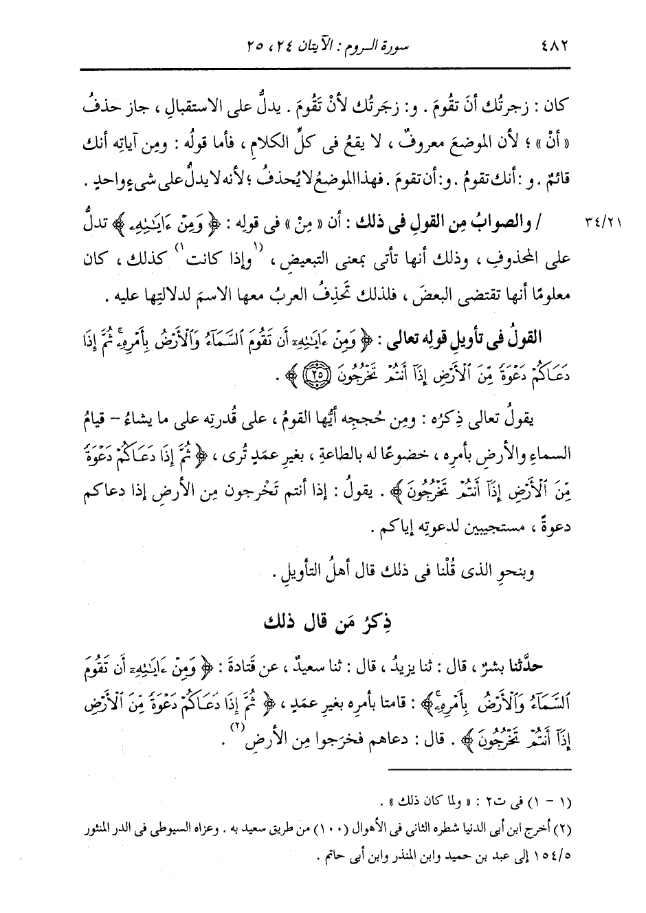 §الْقَوْلُ فِي تَأْوِيلِ قَوْلِهِ تَعَالَى: {وَمِنْ آيَاتِهِ أَنْ تَقُومَ السَّمَاءُ وَالْأَرْضُ بِأَمْرِهِ ثُمَّ إِذَا دَعَاكُمْ دَعْوَةً مِنَ الْأَرْضِ إِذَا أَنْتُمْ تَخْرُجُونَ} [الروم: 25] يَقُولُ تَعَالَى ذِكْرُهُ: وَمِنْ حُجَجِهِ أَيُّهَا الْقَوْمُ عَلَى قُدْرَتِهِ عَلَى مَا يَشَاءُ، قِيَامُ السَّمَاءِ وَالْأَرْضِ بِأَمْرِهِ خُضُوعًا لَهُ بِالطَّاعَةِ بِغَيْرِ عَمَدٍ تُرَى {ثُمَّ إِذَا دَعَاكُمْ دَعْوَةً مِنَ الْأَرْضِ إِذَا أَنْتُمْ تَخْرُجُونَ} [الروم: 25] يَقُولُ: إِذَا أَنْتُمْ تَخْرُجُونَ مِنَ الْأَرْضِ، إِذَا دَعَاكُمْ دَعْوَةً مُسْتَجِيبِينَ لِدَعْوَتِهِ إِيَّاكُمْ. وَبِنَحْوِ الَّذِي قُلْنَا فِي ذَلِكَ قَالَ أَهْلُ التَّأْوِيلِ.