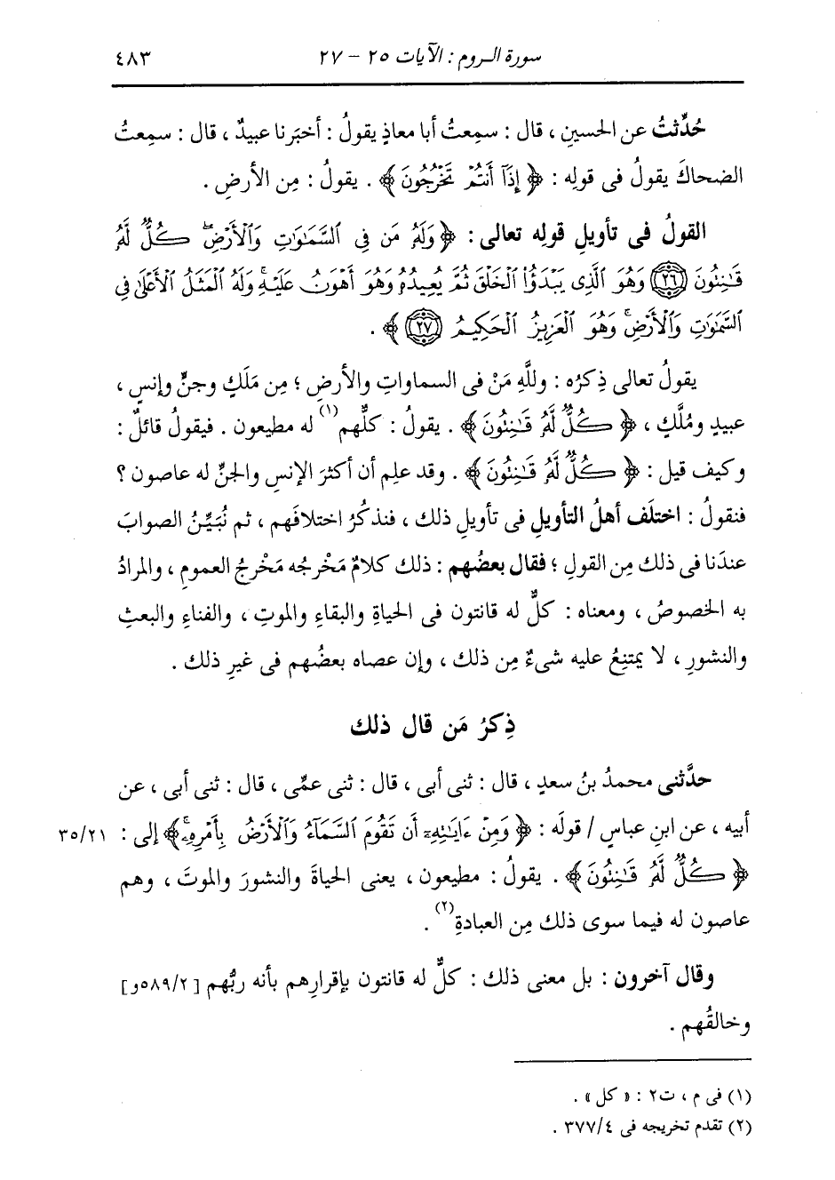 ذِكْرُ مَنْ قَالَ ذَلِكَ: حَدَّثَنِي مُحَمَّدُ بْنُ سَعْدٍ، قَالَ: ثني أَبِي، قَالَ: ثني عَمِّي، قَالَ: ثني أَبِي، عَنْ أَبِيهِ، عَنِ ابْنِ عَبَّاسٍ، قَوْلُهُ " {§وَمِنْ آيَاتِهِ أَنْ تَقُومَ السَّمَاءُ وَالْأَرْضُ بِأَمْرِهِ} [الروم: 25] إِلَى {كُلٌّ لَهُ قَانِتُونَ} [البقرة: 116] يَقُولُ: مُطِيعُونَ، يَعْنِي الْحَيَاةَ وَالنُّشُورَ وَالْمَوْتَ، وَهُمْ عَاصُونَ لَهُ فِيمَا سِوَى ذَلِكَ مِنَ الْعِبَادَةِ ". وَقَالَ آخَرُونَ: بَلْ مَعْنَى ذَلِكَ: كُلٌّ لَهُ قَانِتُونُ بِإِقْرَارِهِمْ بِأَنَّهُ رَبُّهُمْ وَخَالِقُهُمْ.
