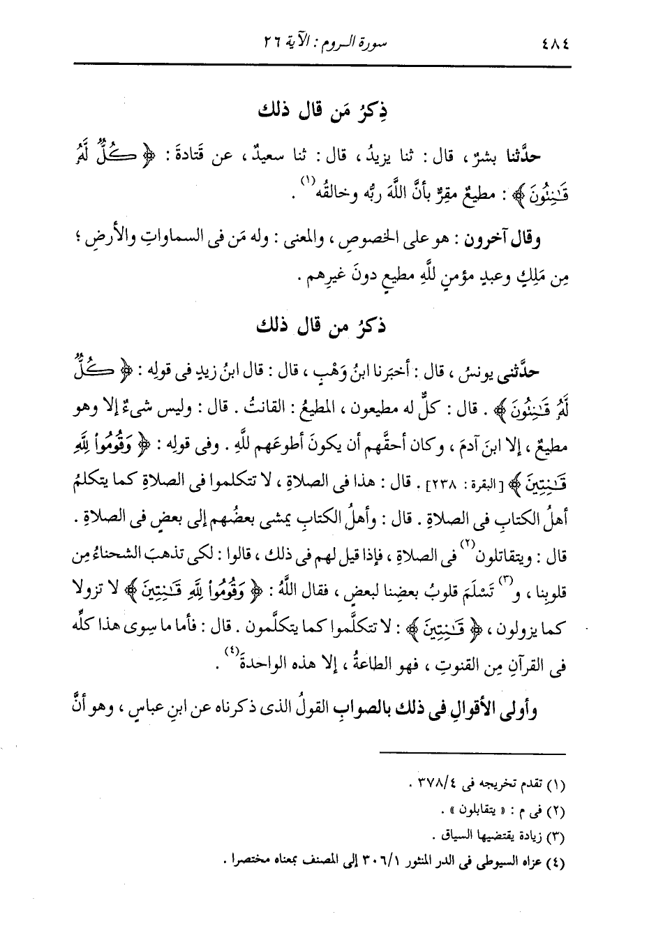 ذِكْرُ مَنْ قَالَ ذَلِكَ: حَدَّثَنِي يُونُسُ، قَالَ: أَخْبَرَنَا ابْنُ وَهْبٍ، قَالَ: قَالَ ابْنُ زَيْدٍ، فِي قَوْلِهِ: " {§كُلٌّ لَهُ قَانِتُونَ} [البقرة: 116] قَالَ: كُلٌّ لَهُ مُطِيعُونَ. الْمُطِيعُ: الْقَانِتُ، قَالَ: وَلَيْسَ شَيْءٌ إِلَّا وَهُوَ مُطِيعٌ، إِلَّا ابْنَ آدَمَ، وَكَانَ أَحَقُّهُمْ أَنْ يَكُونَ أَطْوَعَهُمْ لِلَّهِ ". وَفِي قَوْلِهِ {وَقُومُوا لِلَّهِ قَانِتِينَ} [البقرة: 238] قَالَ: هَذَا فِي الصَّلَاةِ، لَا تَتَكَلَّمُوا فِي الصَّلَاةِ كَمَا يَتَكَلَّمُ أَهْلُ الْكِتَابِ فِي الصَّلَاةِ، قَالَ: وَأَهْلُ الْكِتَابِ يَمْشِي بَعْضُهُمْ إِلَى بَعْضٍ فِي الصَّلَاةِ، قَالَ: وَيَتَقَابَلُونَ فِي الصَّلَاةِ، فَإِذَا قِيلَ لَهُمْ فِي ذَلِكَ، قَالُوا: لِكَيْ تَذْهَبَ الشَّحْنَاءُ مِنْ قُلُوبِنَا وَتَسْلَمَ قُلُوبُ بَعْضِنَا لِبَعْضٍ، فَقَالَ اللَّهُ: {وَقُومُوا لِلَّهِ قَانِتِينَ} [البقرة: 238] لَا تَزُولُوا كَمْ يَزَولُونَ. قَانِتِينَ: لَا تَتَكَلَّمُوا كَمَا يَتَكَلَّمُونَ. قَالَ: فَأَمَّا مَا سِوَى هَذَا كُلُّهُ فِي الْقُرْآنِ مِنَ الْقُنُوتِ فَهُوَ الطَّاعَةُ، إِلَّا هَذِهِ الْوَاحِدَةَ. وَأَوْلَى الْأَقْوَالِ فِي ذَلِكَ بِالصَّوَابِ الْقَوْلُ الَّذِي ذَكَرْنَاهُ عَنِ ابْنِ عَبَّاسٍ: وَهُوَ أَنَّ