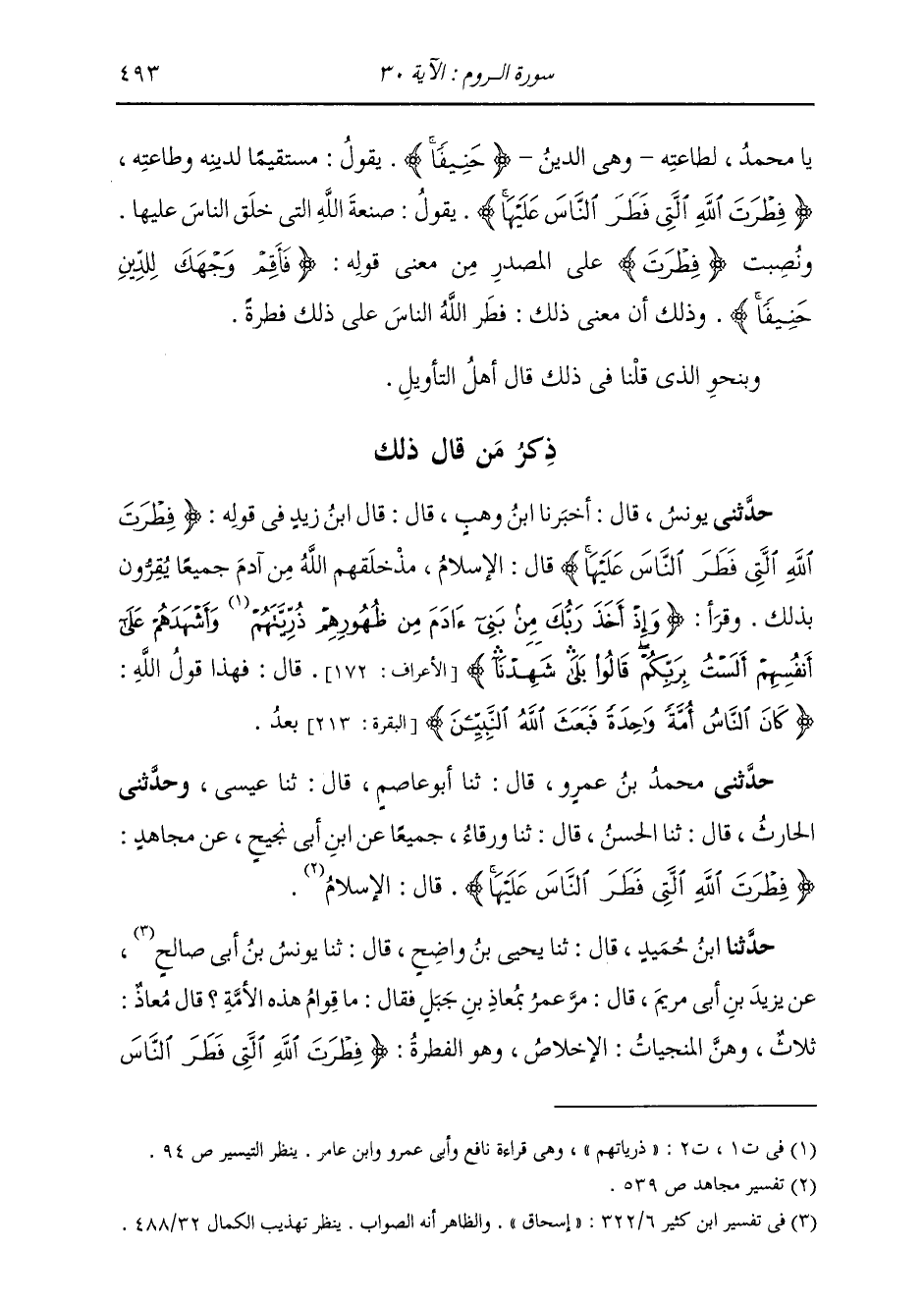حَدَّثَنِي مُحَمَّدُ بْنُ عَمْرٍو، قَالَ: ثنا أَبُو عَاصِمٍ، قَالَ: ثنا عِيسَى، وَحَدَّثَنِي الْحَارِثُ، قَالَ: ثنا الْحَسَنُ، قَالَ: ثنا وَرْقَاءُ، جَمِيعًا، عَنِ ابْنِ أَبِي نَجِيحٍ، عَنْ مُجَاهِدٍ، " {§فِطْرَةَ اللَّهِ} [الروم: 30] قَالَ: الْإِسْلَامُ "