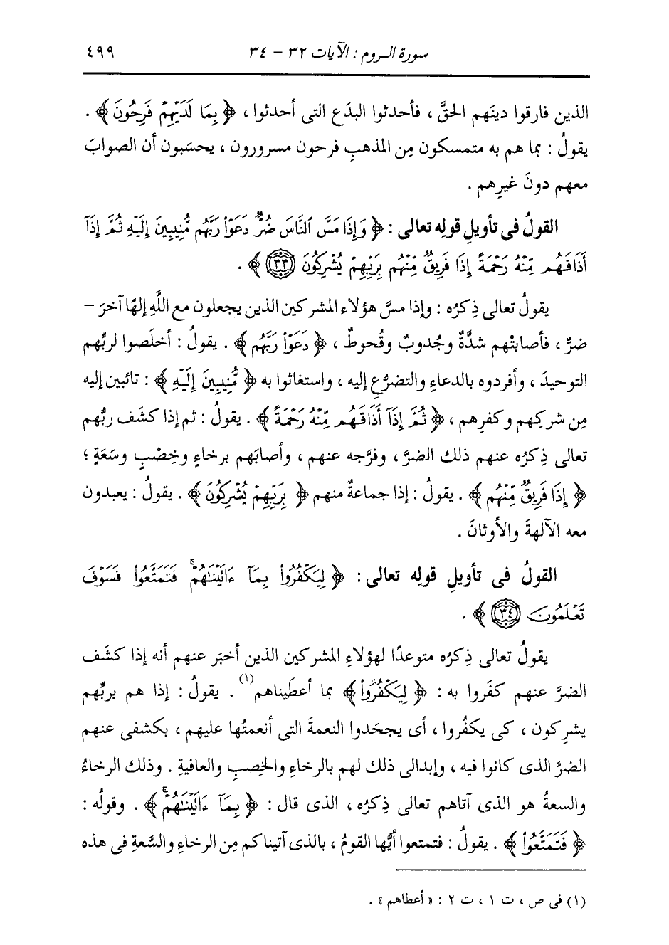 §الْقَوْلُ فِي تَأْوِيلِ قَوْلِهِ تَعَالَى: {وَإِذَا مَسَّ النَّاسَ ضُرٌّ دَعَوْا رَبَّهُمْ مُنِيبِينَ إِلَيْهِ، ثُمَّ إِذَا أَذَاقَهُمْ مِنْهُ رَحْمَةً إِذَا فَرِيقٌ مِنْهُمْ بِرَبِّهِمْ يُشْرِكُونَ} [الروم: 33] يَقُولُ تَعَالَى ذِكْرُهُ: وَإِذَا مَسَّ هَؤُلَاءِ الْمُشْرِكِينَ الَّذِينَ يَجْعَلُونَ مَعَ اللَّهِ إِلَهًا آخَرَ ضُرٌّ، فَأَصَابَتْهُمْ شِدَّةٌ وَجُدُوبٌ وَقُحُوطٌ {دَعَوْا رَبَّهُمْ} [الروم: 33] يَقُولُ: أَخْلَصُوا لِرَبِّهِمُ التَّوْحِيدَ، وَأَفْرَدُوهُ بِالدُّعَاءِ وَالتَّضَرُّعِ إِلَيْهِ، وَاسْتَغَاثُوا بِهِ مُنِيبِينَ إِلَيْهِ، تَائِبِينَ إِلَيْهِ مِنْ شِرْكِهِمْ وَكْفُرِهِمْ {ثُمَّ إِذَا أَذَاقَهُمْ مِنْهُ رَحْمَةً} [الروم: 33] يَقُولُ: ثُمَّ إِذَا كَشَفَ رَبُّهُمْ تَعَالَى ذِكْرُهُ عَنْهُمْ ذَلِكَ الضُّرَّ وَفَرَّجَهُ عَنْهُمْ وَأَصَابَهُمْ بِرَخَاءٍ وَخِصْبٍ وَسَعَةٍ {إِذَا فَرِيقٌ مِنْهُمْ} [النساء: 77] يَقُولُ: إِذَا جَمَاعَةٌ مِنْهُمْ بِرَبِّهِمْ {يُشْرِكُونَ} [الأعراف: 190] يَقُولُ: يَعْبُدُونَ مَعَهُ الْآلِهَةَ وَالْأَوْثَانَ.