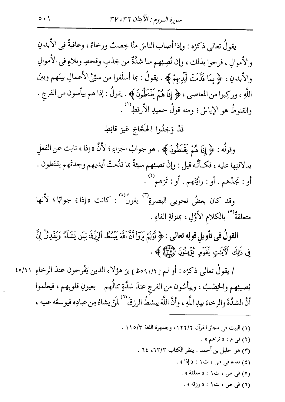 وَقَوْلُهُ: {إِذَا هُمْ يَقْنَطُونَ} [الروم: 36] هُوَ جَوَابُ الْجَزَاءِ، لِأَنَّ «إِذَا» نَابَتْ عَنِ الْفِعْلِ بِدِلَالَتِهَا عَلَيْهِ، فَكَأَنَّهُ قِيلَ: وَإِنْ تُصِبْهُمْ سَيِّئَةٌ بِمَا قَدَّمَتْ أَيْدِيهِمْ وَجَدْتَهُمْ يَقْنَطُونَ، أَوْ تَجِدُهُمْ، أَوْ رَأَيْتَهُمْ، أَوْ تَرَاهُمْ. وَقَدْ كَانَ بَعْضُ نَحْوِيِّي الْبَصْرَةِ يَقُولُ: إِذَا كَانَتْ «إِذَا» جَوَابًا لِأَنَّهَا مُتَعَلِّقَةٌ بِالْكَلَامِ الْأَوَّلِ بِمَنْزِلَةِ الْفَاءِ.