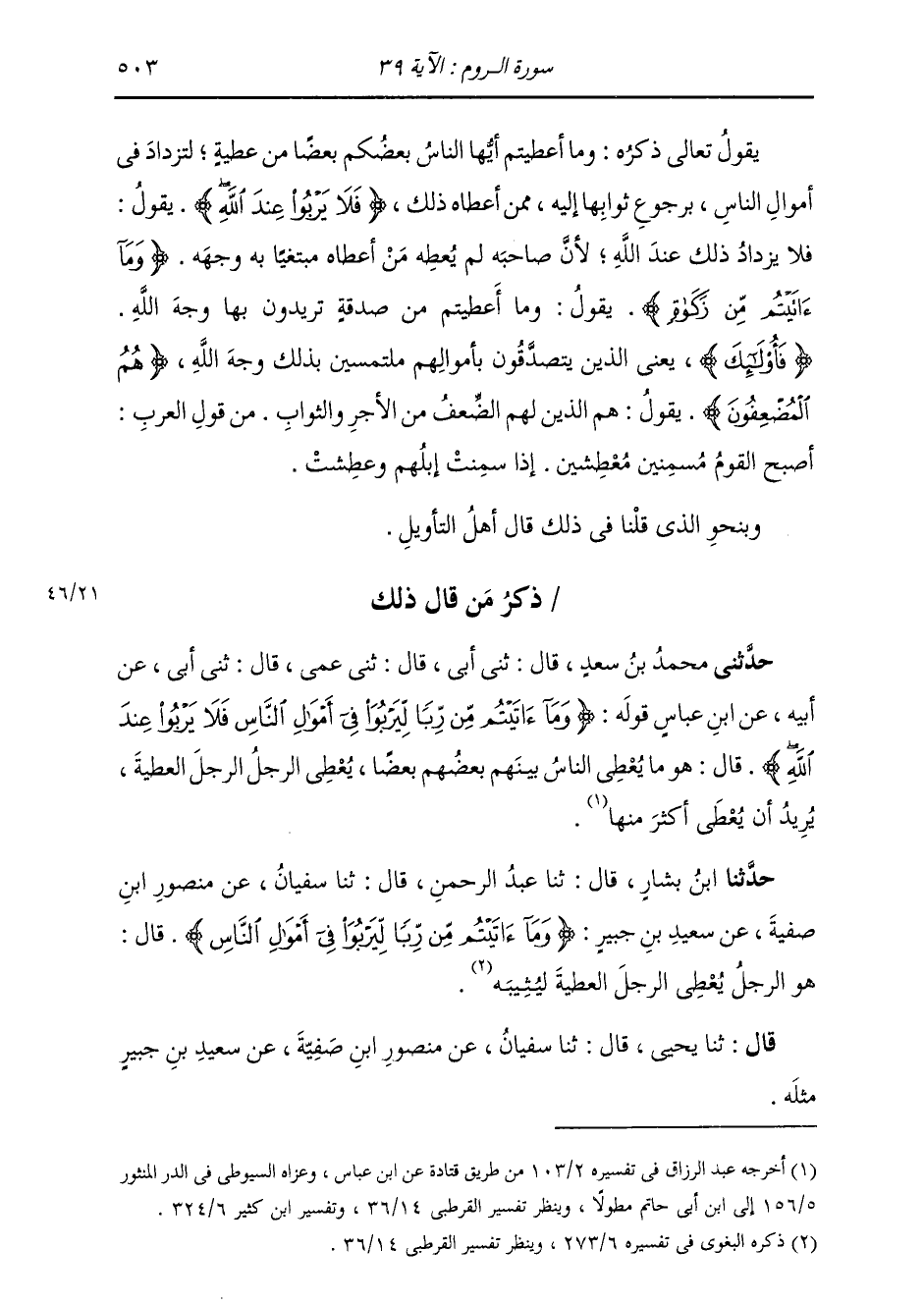 حَدَّثَنَا ابْنُ بَشَّارٍ، قَالَ: ثَنَا عَبْدُ الرَّحْمَنِ، قَالَ: ثَنَا سُفْيَانُ، عَنْ مَنْصُورِ بْنِ صَفِيَّةَ، عَنْ سَعِيدِ بْنِ جُبَيْرٍ، " {§مَا آتَيْتُمْ مِنْ رِبًا لِيَرْبُوَ فِي أَمْوَالِ النَّاسِ} [الروم: 39] قَالَ: هُوَ الرَّجُلُ يُعْطِي الرَّجُلَ الْعَطِيَّةَ لِيُثِيبَهُ ". قَالَ: ثَنَا يَحْيَى قَالَ: ثنا سُفْيَانُ، عَنْ مَنْصُورِ بْنِ صَفِيَّةَ، عَنْ سَعِيدِ بْنِ جُبَيْرٍ، مِثْلَهُ