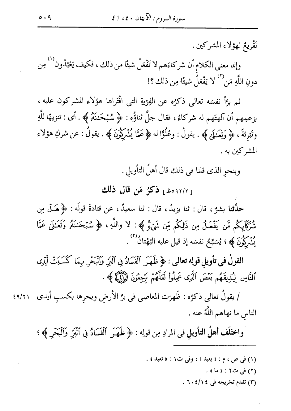 ذِكْرُ مَنْ قَالَ ذَلِكَ: حَدَّثَنَا بِشْرٌ، قَالَ: ثَنَا يَزِيدُ، قَالَ: ثَنَا سَعِيدٌ، عَنْ قَتَادَةَ، قَوْلُهُ: " {§هَلْ مِنْ شُرَكَائِكُمْ مَنْ يَفْعَلُ مِنْ ذَلِكُمْ مِنْ شَيْءٍ} [الروم: 40] لَا وَاللَّهِ {سُبْحَانَهُ وَتَعَالَى عَمَّا يُشْرِكُونَ} [الروم: 40] يُسَبِّحُ نَفْسَهُ إِذْ قِيلَ عَلَيْهِ الْبُهْتَانُ "