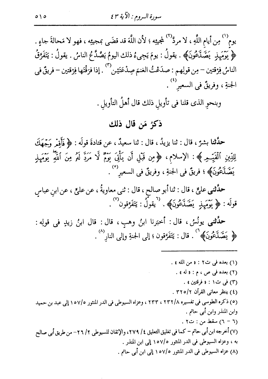 ذِكْرُ مَنْ قَالَ ذَلِكَ: حَدَّثَنَا بِشْرٌ، قَالَ: ثَنَا يَزِيدُ، قَالَ: ثَنَا سَعِيدٌ، عَنْ قَتَادَةَ، قَوْلُهُ: " {§فَأَقِمْ وَجْهَكَ لِلدِّينِ الْقَيِّمِ} [الروم: 43] الْإِسْلَامِ {مِنْ قَبْلِ أَنْ يَأْتِيَ يَوْمٌ لَا مَرَدَّ لَهُ مِنَ اللَّهِ، يَوْمَئِذٍ يَصَّدَّعُونَ} [الروم: 43] فَرِيقٌ فِي الْجَنَّةِ، وَفَرِيقٌ فِي السَّعِيرِ "