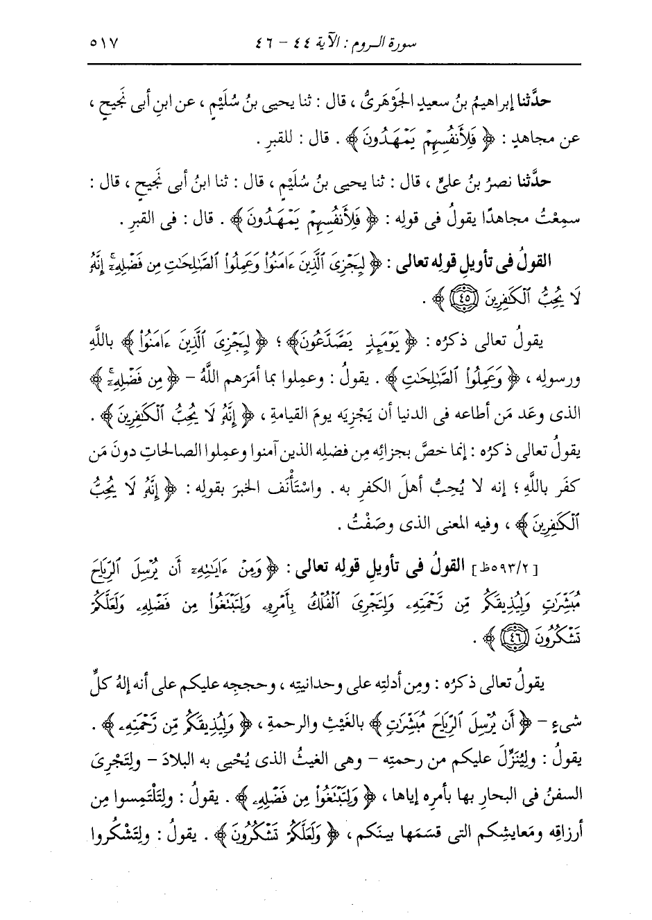 حَدَّثَنَا إِبْرَاهِيمُ بْنُ سَعِيدٍ الْجَوْهَرِيُّ، قَالَ: ثَنَا يَحْيَى بْنُ سُلَيْمٍ، عَنِ ابْنِ أَبِي نَجِيحٍ، عَنْ مُجَاهِدٍ: " {§فَلِأَنْفُسِهِمْ يَمْهَدُونَ} [الروم: 44] قَالَ: لِلْقَبْرِ "