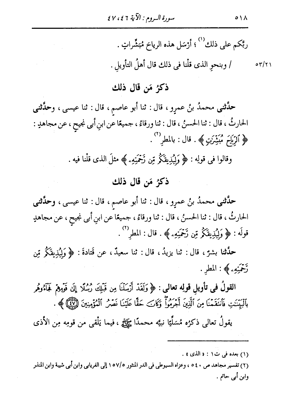 ذِكْرُ مَنْ قَالَ ذَلِكَ: حَدَّثَنِي مُحَمَّدُ بْنُ عَمْرٍو، قَالَ: ثَنَا أَبُو عَاصِمٍ، قَالَ: ثَنَا عِيسَى، وَحَدَّثَنِي الْحَارِثُ، قَالَ: ثَنَا الْحَسَنُ، قَالَ: ثَنَا وَرْقَاءُ، جَمِيعًا، عَنِ ابْنِ أَبِي نَجِيحٍ، عَنْ مُجَاهِدٍ، " {§الرِّيَاحَ مُبَشِّرَاتٍ} [الروم: 46] قَالَ: بِالْمَطَرِ ". وَقَالُوا فِي قَوْلِهِ: {وَلِيُذِيقَكُمْ مِنْ رَحْمَتِهِ} [الروم: 46] مِثْلَ الَّذِي قُلْنَا فِيهِ