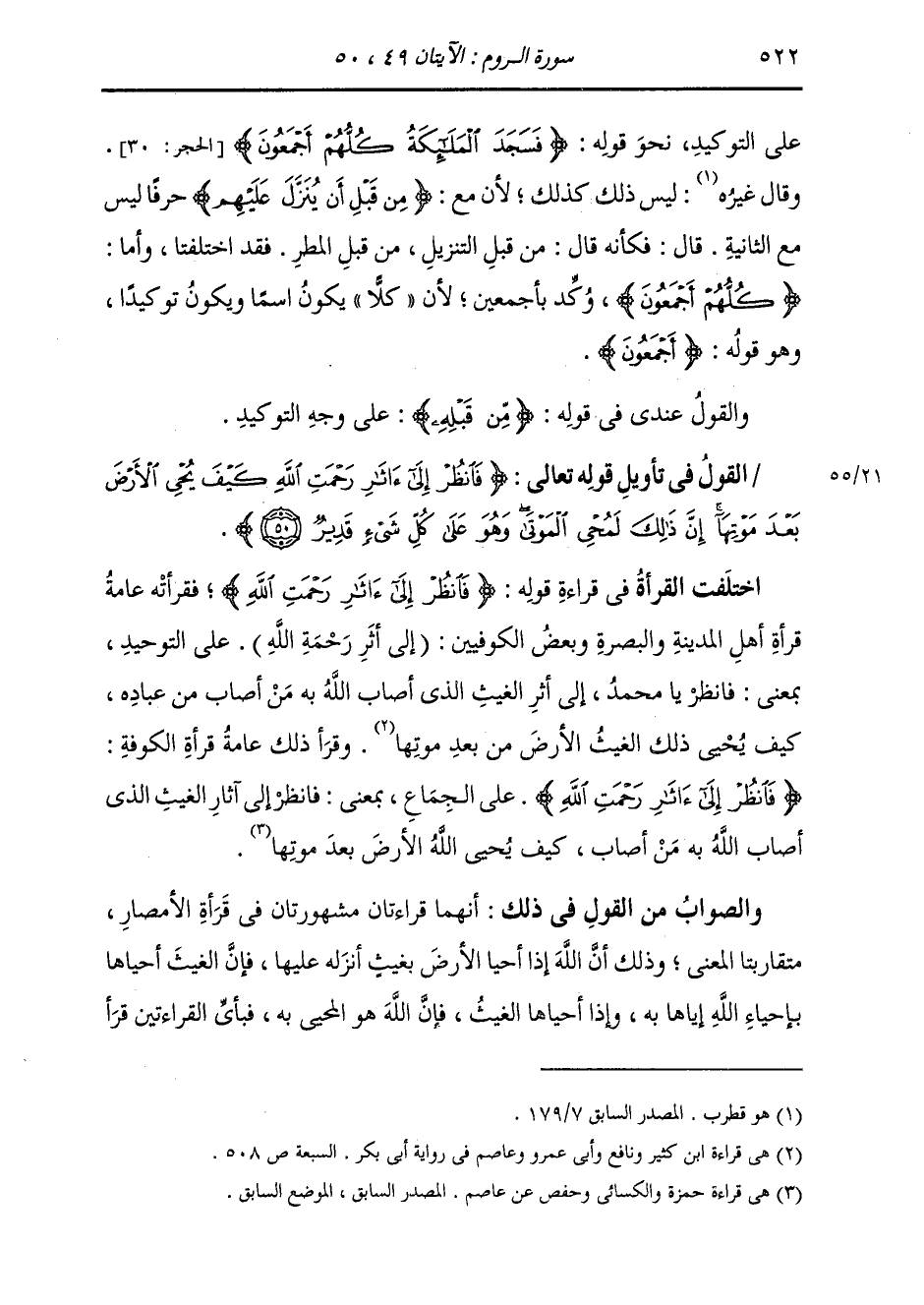 §الْقَوْلُ فِي تَأْوِيلِ قَوْلِهِ تَعَالَى: {فَانْظُرْ إِلَى آثَارِ رَحَمَةِ اللَّهِ كَيْفَ يُحْيِي الْأَرْضَ بَعْدَ مَوْتِهَا} اخْتَلَفَتِ الْقُرَّاءُ فِي قَوْلِهِ: {فَانْظُرْ إِلَى آثَارِ رَحْمَةِ اللَّهِ} فَقَرَأَتْهُ عَامَّةُ قُرَّاءِ أَهْلِ الْمَدِينَةِ وَالْبَصْرَةِ وَبَعْضُ الْكُوفِيِّينَ: (إِلَى أَثَرِ رَحْمَةِ اللَّهِ) ، عَلَى التَّوْحِيدِ، بِمَعْنَى: فَانْظُرْ يَا مُحَمَّدُ إِلَى أَثَرِ الْغَيْثِ الَّذِي أَصَابَ اللَّهُ بِهِ مَنْ أَصَابَ مِنْ عِبَادِهِ، كَيْفَ يُحْيِي ذَلِكَ الْغَيْثُ الْأَرْضَ مِنْ بَعْدِ مَوْتِهَا. وَقَرَأَ ذَلِكَ عَامَّةُ قُرَّاءِ الْكُوفَةِ: {فَانْظُرْ إِلَى آثَارِ رَحْمَةِ اللَّهِ} ، عَلَى الْجِمَاعِ، بِمَعْنَى: فَانْظُرْ إِلَى آثَارِ الْغَيْثِ الَّذِي أَصَابَ اللَّهُ بِهِ مَنْ أَصَابَ كَيْفَ يُحْيِي الْأَرْضَ بَعْدَ مَوْتِهَا. وَالصَّوَابُ مِنَ الْقَوْلِ فِي ذَلِكَ، أَنَّهُمَا قِرَاءَتَانِ مَشْهُورَتَانِ فِي قِرَاءَةِ الْأَمْصَارِ، مُتَقَارِبَتَا الْمَعْنَى؛ وَذَلِكَ أَنَّ اللَّهَ إِذَا أَحْيَا الْأَرْضَ بِغَيْثٍ أَنْزَلَهُ عَلَيْهَا، فَإِنَّ الْغَيْثَ أَحْيَاهَا بِإِحْيَاءِ اللَّهِ إِيَّاهَا بِهِ، وَإِذَا أَحْيَاهَا الْغَيْثُ، فَإِنَّ اللَّهَ هُوَ الْمُحْيِي بِهِ، فَبِأَيِّ الْقِرَاءَتَيْنِ قَرَأَ