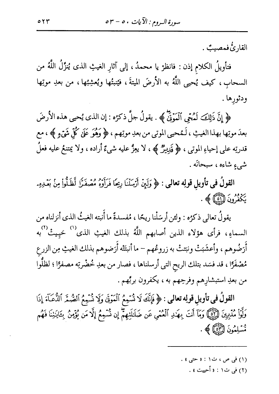الْقَارِئُ فَمُصِيبٌ. فَتَأْوِيلُ الْكَلَامِ إِذَنْ: فَانْظُرْ يَا مُحَمَّدُ إِلَى آثَارِ الْغَيْثِ الَّذِي يُنَزِّلُ اللَّهُ مِنَ السَّحَابِ، كَيْفَ يُحْيِي بِهَا الْأَرْضَ الْمَيْتَةَ، فَيُنْبِتُهَا وَيُعْشِبُهَا مِنْ بَعْدِ مَوْتِهَا , وَدُثُورِهَا {إِنَّ ذَلِكَ لَمُحْيِي الْمَوْتَى} [الروم: 50] يَقُولُ جَلَّ ذِكْرُهُ: إِنَّ الَّذِي يُحْيِي هَذِهِ الْأَرْضَ بَعْدَ مَوْتِهَا بِهَذَا الْغَيْثِ، لَمُحْيِي الْمَوْتَى مِنْ بَعْدِ مَوْتِهِمْ، وَهُوَ عَلَى كُلِّ شَيْءٍ مَعَ قُدْرَتِهِ عَلَى إِحْيَاءِ الْمَوْتَى قَدِيرٌ، لَا يَعِزُّ عَلَيْهِ شَيْءٌ أَرَادَهُ، وَلَا يَمْتَنِعُ عَلَيْهِ فِعْلُ شَيْءٍ شَاءَهُ سُبْحَانَهُ