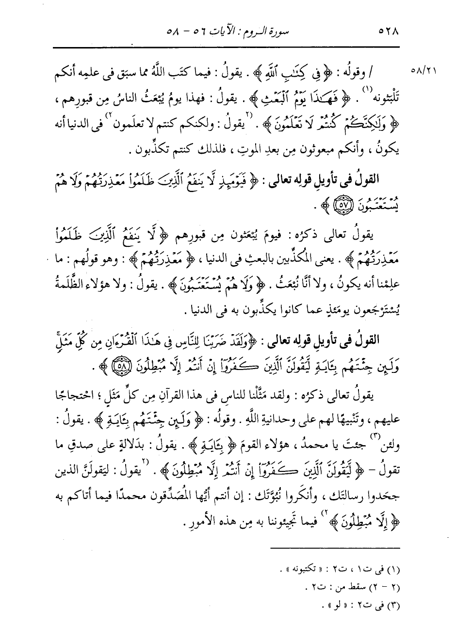 §وَقَوْلُهُ: {فِي كِتَابِ اللَّهِ} [الأنفال: 75] يَقُولُ: فِيمَا كَتَبَ اللَّهُ مِمَّا سَبَقَ فِي عِلْمِهِ أَنَّكُمْ تَلْبَثُونَهُ {فَهَذَا يَوْمُ الْبَعْثِ} [الروم: 56] يَقُولُ: فَهَذَا يَوْمُ يُبْعَثُ النَّاسُ مِنْ قُبُورِهِمْ {وَلَكِنَّكُمْ كُنْتُمْ لَا تَعْلَمُونَ} [الروم: 56] يَقُولُ: وَلَكِنَّكُمْ كُنْتُمْ لَا تَعْلَمُونَ فِي الدُّنْيَا أَنَّهُ يَكُونُ، وَأَنَّكُمْ مَبْعُوثُونَ مِنْ بَعْدِ الْمَوْتِ، فَلِذَلِكَ كُنْتُمْ تَكْذِبُونَ.