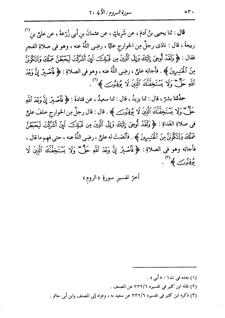حَدَّثَنَا بِشْرٌ، قَالَ: ثَنَا يَزِيدُ، قَالَ: ثَنَا سَعِيدٌ، عَنْ قَتَادَةَ، {§فَاصْبِرْ إِنَّ وَعْدَ اللَّهِ حَقٌّ، وَلَا يَسْتَخِفَّنَّكَ الَّذِينَ لَا يُوقِنُونَ} [الروم: 60] قَالَ: قَالَ رَجُلٌ مِنَ الْخَوَارِجِ خَلْفَ عَلِيٍّ فِي صَلَاةِ الْغَدَاةِ: " {وَلَقَدْ أُوحِيَ إِلَيْكَ وَإِلَى الَّذِينَ مِنْ قَبْلِكَ لَئِنْ أَشْرَكْتَ لَيَحْبَطَنَّ عَمَلُكَ وَلَتَكُونَنَّ مِنَ الْخَاسِرِينَ} [الزمر: 65] , فَأَنْصَتَ لَهُ عَلِيٌّ رَضِيَ اللَّهُ عَنْهُ حَتَّى فَهِمَ مَا قَالَ، فَأَجَابَهُ وَهُوَ فِي الصَّلَاةِ: {فَاصْبِرْ إِنَّ وَعْدَ اللَّهِ حَقٌّ، وَلَا يَسْتَخِفَّنَّكَ الَّذِينَ لَا يُوقِنُونَ} [الروم: 60] "