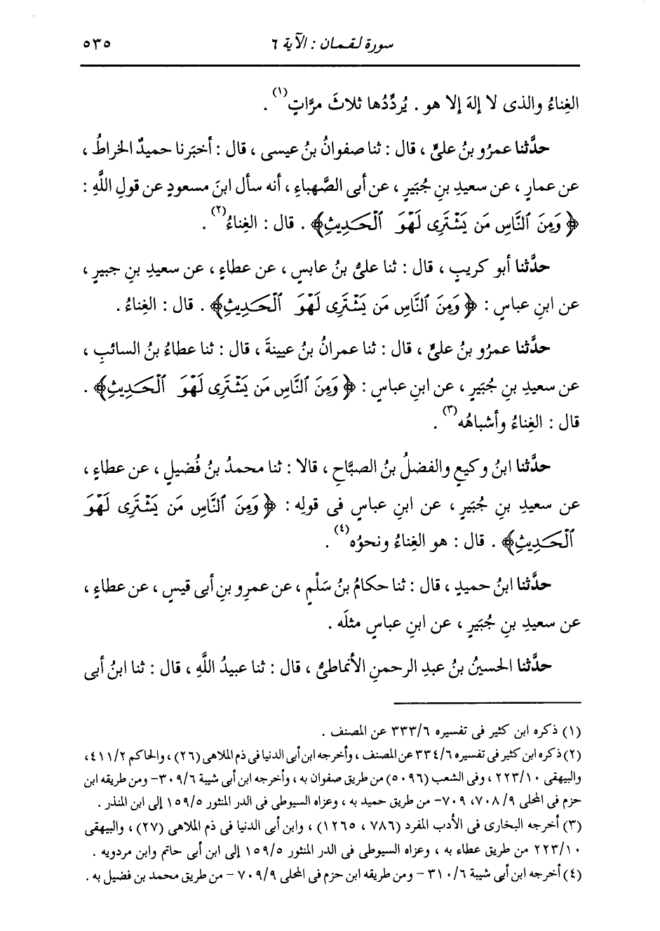 حَدَّثَنَا عَمْرُو بْنُ عَلِيٍّ، قَالَ: ثَنَا عِمْرَانُ بْنُ عُيَيْنَةَ، قَالَ: ثَنَا عَطَاءُ بْنُ السَّائِبِ، عَنْ سَعِيدِ بْنِ جُبَيْرٍ، عَنِ ابْنِ عَبَّاسٍ، " {§وَمِنَ النَّاسِ مَنْ يَشْتَرِي لَهْوَ الْحَدِيثِ} [لقمان: 6] قَالَ: الْغِنَاءُ وَأَشْبَاهُهُ "