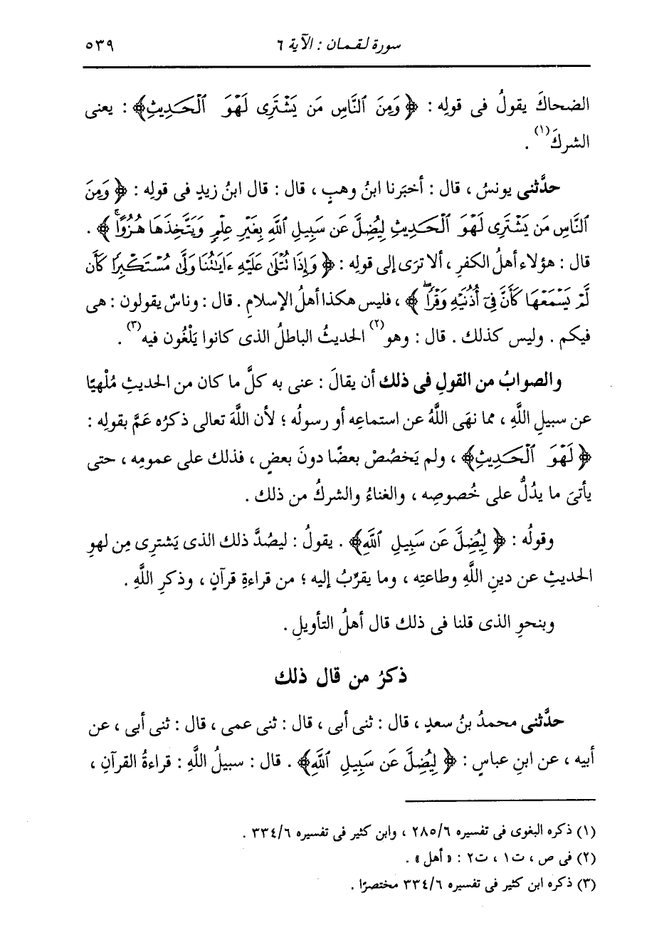 حَدَّثَنِي يُونُسُ، قَالَ: أَخْبَرَنَا ابْنُ وَهْبٍ، قَالَ: قَالَ ابْنُ زَيْدٍ، فِي قَوْلِهِ " {§وَمِنَ النَّاسِ مَنْ يَشْتَرِي لَهْوَ الْحَدِيثِ لِيُضِلَّ عَنْ سَبِيلِ اللَّهِ بِغَيْرِ عِلْمٍ وَيَتَّخِذَهَا هُزُوًا} [لقمان: 6] قَالَ: هَؤُلَاءِ أَهْلُ الْكُفْرِ، أَلَا تَرَى إِلَى قَوْلِهِ: {وَإِذَا تُتْلَى عَلَيْهِ آيَاتُنَا وَلَّى مُسْتَكْبِرًا كَأَنْ لَمْ يَسْمَعْهَا كَأَنَّ فِي أُذُنَيْهِ وَقْرًا} [لقمان: 7] فَلَيْسَ هَكَذَا أَهْلُ الْإِسْلَامِ، قَالَ: وَنَاسٌ يَقُولُونَ: هِيَ فِيكُمْ، وَلَيْسَ كَذَلِكَ، قَالَ: وَهُوَ الْحَدِيثُ الْبَاطِلِ الَّذِي كَانُوا يَلْغَوْنَ فِيهِ ". وَالصَّوَابُ مِنَ الْقَوْلِ فِي ذَلِكَ أَنْ يُقَالَ: عَنَى بِهِ كُلَّ مَا كَانَ مِنَ الْحَدِيثِ مُلْهِيًا عَنْ سَبِيلِ اللَّهِ، مِمَّا نَهَى اللَّهُ عَنِ اسْتِمَاعِهِ أَوْ رَسُولُهُ، لِأَنَّ اللَّهَ تَعَالَى عَمَّ بِقَوْلِهِ {لَهْوَ الْحَدِيثِ} [لقمان: 6] وَلَمْ يُخَصِّصْ بَعْضًا دُونَ بَعْضٍ، فَذَلِكَ عَلَى عُمُومِهِ، حَتَّى يَأْتِيَ مَا يَدُلُّ عَلَى خُصُوصِهِ، وَالْغِنَاءُ وَالشِّرْكُ مِنْ ذَلِكَ.