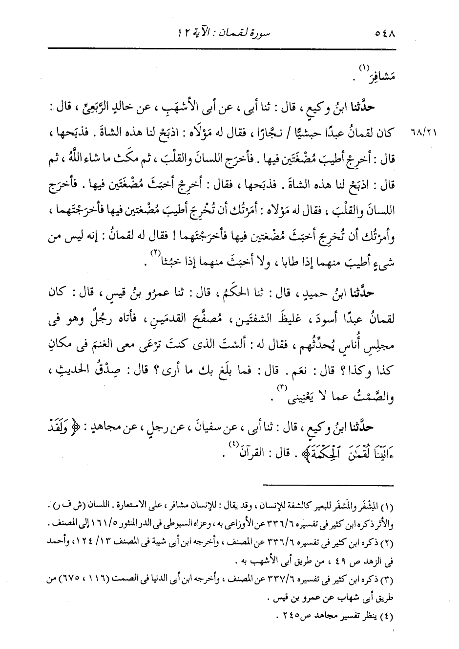 حَدَّثَنَا ابْنُ وَكِيعٍ، قَالَ: ثَنَا أَبِي، عَنْ سُفْيَانَ، عَنْ رَجُلٍ، عَنْ مُجَاهِدٍ، " {§وَلَقَدْ آتَيْنَا لُقْمَانَ الْحِكْمَةَ} [لقمان: 12] قَالَ: الْقُرْآنَ "