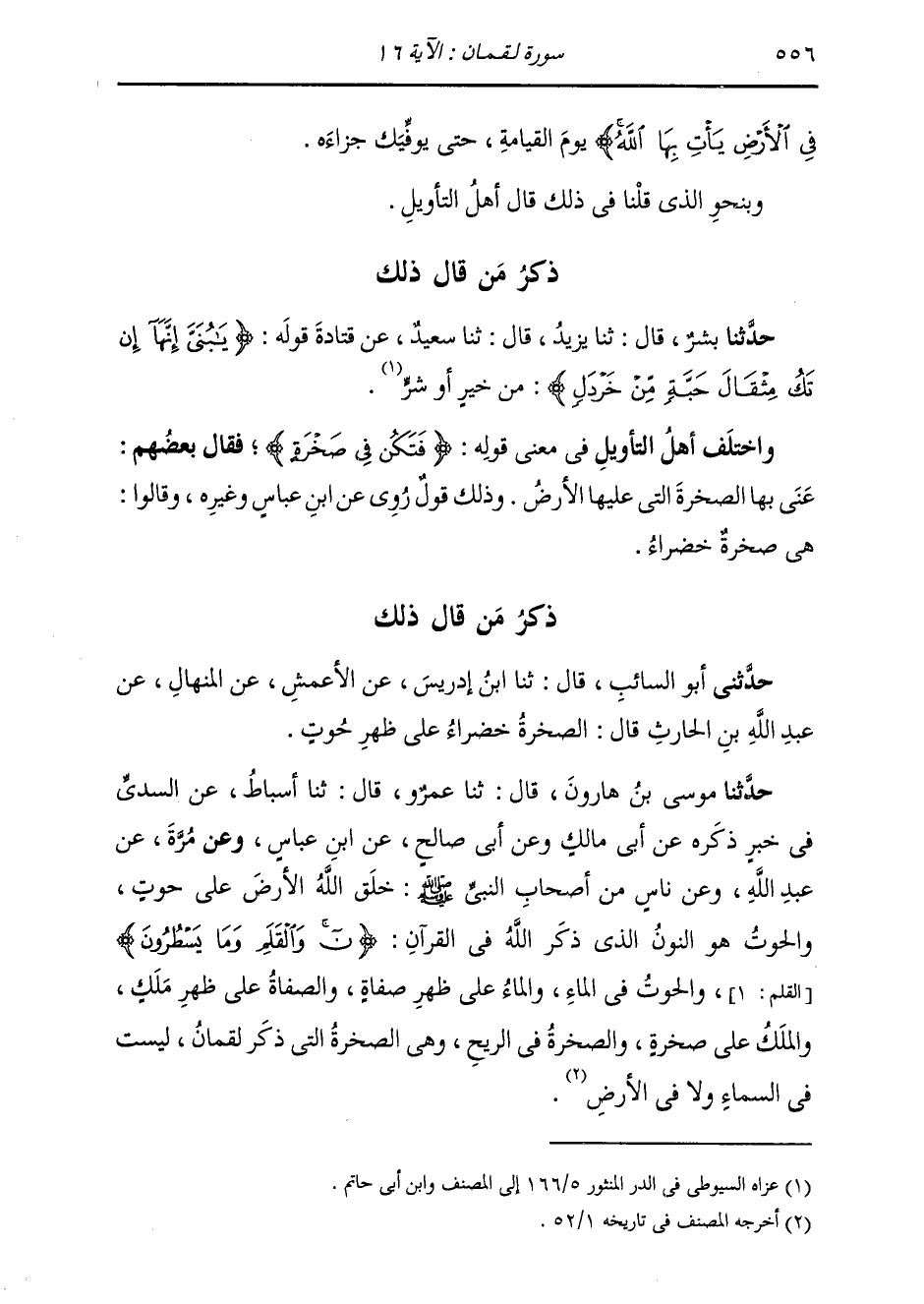 حَدَّثَنَا مُوسَى بْنُ هَارُونَ، قَالَ: ثَنَا عَمْرٌو، قَالَ: ثَنَا أَسْبَاطٌ، عَنِ السُّدِّيِّ، فِي خَبَرٍ ذَكَرَهُ عَنْ أَبِي مَالِكٍ، عَنْ أَبِي صَالِحٍ، عَنِ ابْنِ عَبَّاسٍ، وَعَنْ مُرَّةَ، عَنْ عَبْدِ اللَّهِ، وَعَنْ نَاسٍ، مِنْ أَصْحَابِ النَّبِيِّ صَلَّى اللهُ عَلَيْهِ وَسَلَّمَ: " §خَلَقَ اللَّهُ الْأَرْضَ عَلَى حُوتٍ، وَالْحُوتُ هُوَ النُّونُ الَّذِي ذَكَرَ اللَّهُ فِي الْقُرْآنِ {ن وَالْقَلَمِ وَمَا يَسْطُرُونَ} [القلم: 1] وَالْحُوتُ فِي الْمَاءِ، وَالْمَاءُ عَلَى ظَهْرِ صَفَاةٍ، وَالصَّفَاةُ عَلَى ظَهْرِ مَلَكٍ، وَالْمَلَكُ عَلَى صَخْرَةٍ، وَالصَّخْرَةُ فِي الرِّيحِ، وَهِيَ الصَّخْرَةُ الَّتِي ذَكَرَ لُقْمَانُ لَيْسَتْ فِي السَّمَاءِ، وَلَا فِي الْأَرْضِ ". -[557]- وَقَالَ آخَرُونَ: عَنَى بِهَا الْجِبَالَ، قَالُوا: وَمَعْنَى الْكَلَامِ: فَتَكُنْ فِي جَبَلٍ