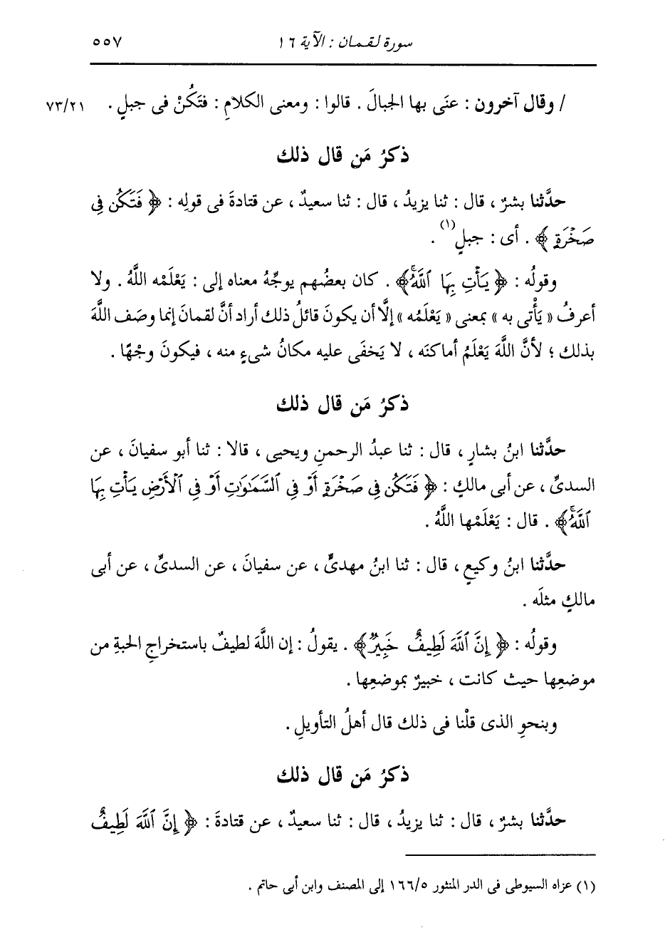 ذِكْرُ مَنْ قَالَ ذَلِكَ: حَدَّثَنَا ابْنُ بَشَّارٍ، قَالَ: ثَنَا عَبْدُ الرَّحْمَنِ، وَيَحْيَى، قَالَا: ثَنَا أَبُو سُفْيَانَ، عَنِ السُّدِّيِّ، عَنْ أَبِي مَالِكٍ، " {§فَتَكُنْ فِي صَخْرَةٍ أَوْ فِي السَّمَوَاتِ أَوْ فِي الْأَرْضِ يَأْتِ بِهَا اللَّهُ} قَالَ: يَعْلَمُهَا اللَّهُ ". حَدَّثَنَا ابْنُ وَكِيعٍ، قَالَ: ثَنَا ابْنُ مَهْدِيٍّ، عَنْ سُفْيَانَ، عَنِ السُّدِّيِّ، عَنْ أَبِي مَالِكٍ، مِثْلَهُ. وَقَوْلُهُ: {إِنَّ اللَّهَ لَطِيفٌ خَبِيرٌ} [لقمان: 16] يَقُولُ: إِنَّ اللَّهَ لَطِيفٌ بِاسْتِخْرَاجِ الْحَبَّةِ مِنْ مَوْضِعِهَا حَيْثُ كَانَتْ خَبِيرٌ بِمَوْضِعِهَا. وَبِنَحْوِ الَّذِي قُلْنَا فِي ذَلِكَ قَالَ أَهْلُ التَّأْوِيلِ.