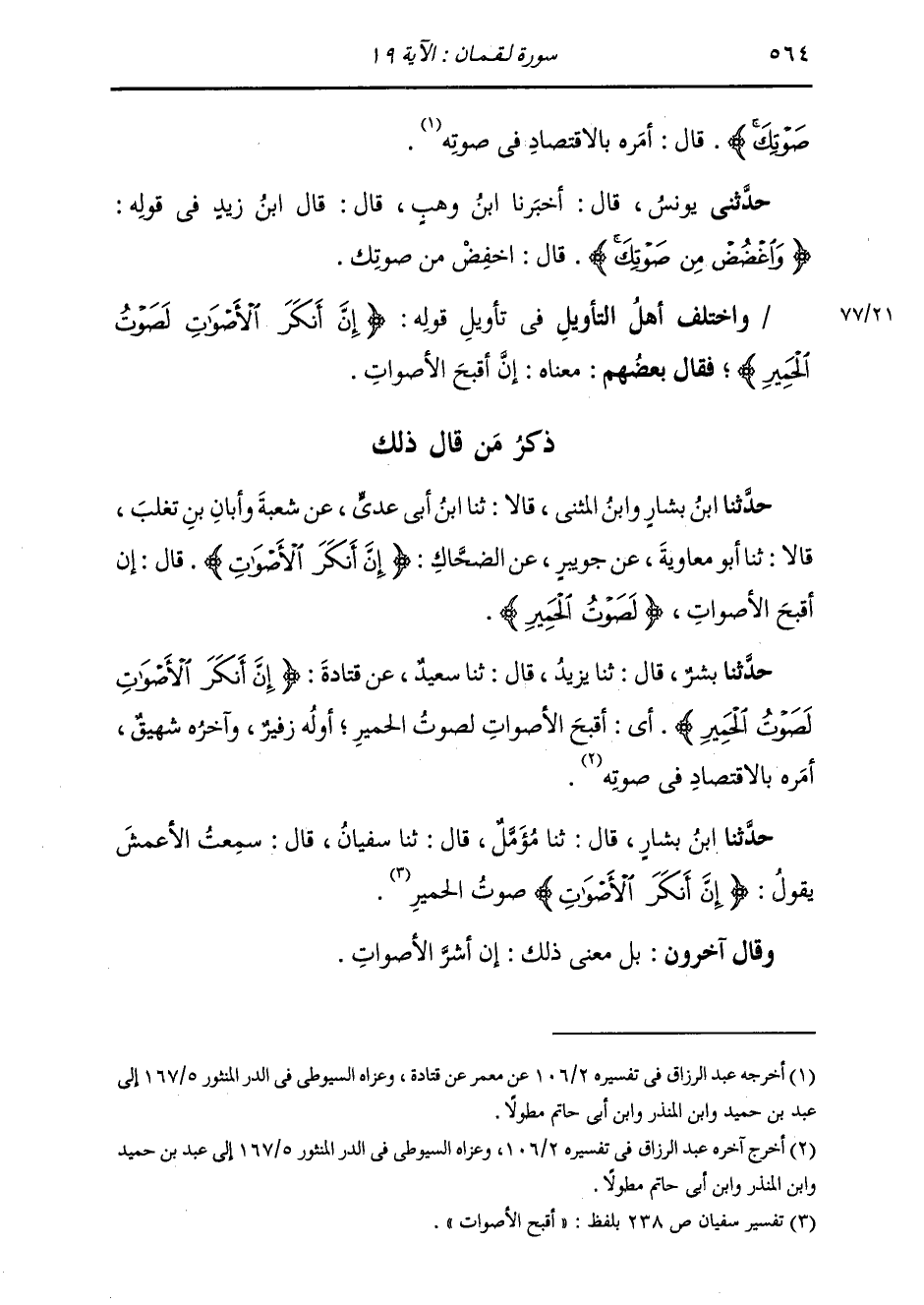 حَدَّثَنِي يُونُسُ، قَالَ: أَخْبَرَنَا ابْنُ وَهْبٍ، قَالَ: قَالَ ابْنُ زَيْدٍ، فِي قَوْلِهِ " {§وَاغْضُضْ مِنْ صَوْتِكَ} [لقمان: 19] قَالَ: أَخْفِضْ مِنْ صَوْتِكَ ". وَاخْتَلَفَ أَهْلُ التَّأْوِيلِ فِي تَأْوِيلِ قَوْلِهِ: {إِنَّ أَنْكَرَ الْأَصْوَاتِ لَصَوْتُ الْحَمِيرِ} [لقمان: 19] فَقَالَ بَعْضُهُمْ: مَعْنَاهُ: إِنَّ أَقْبَحَ الْأَصْوَاتِ.