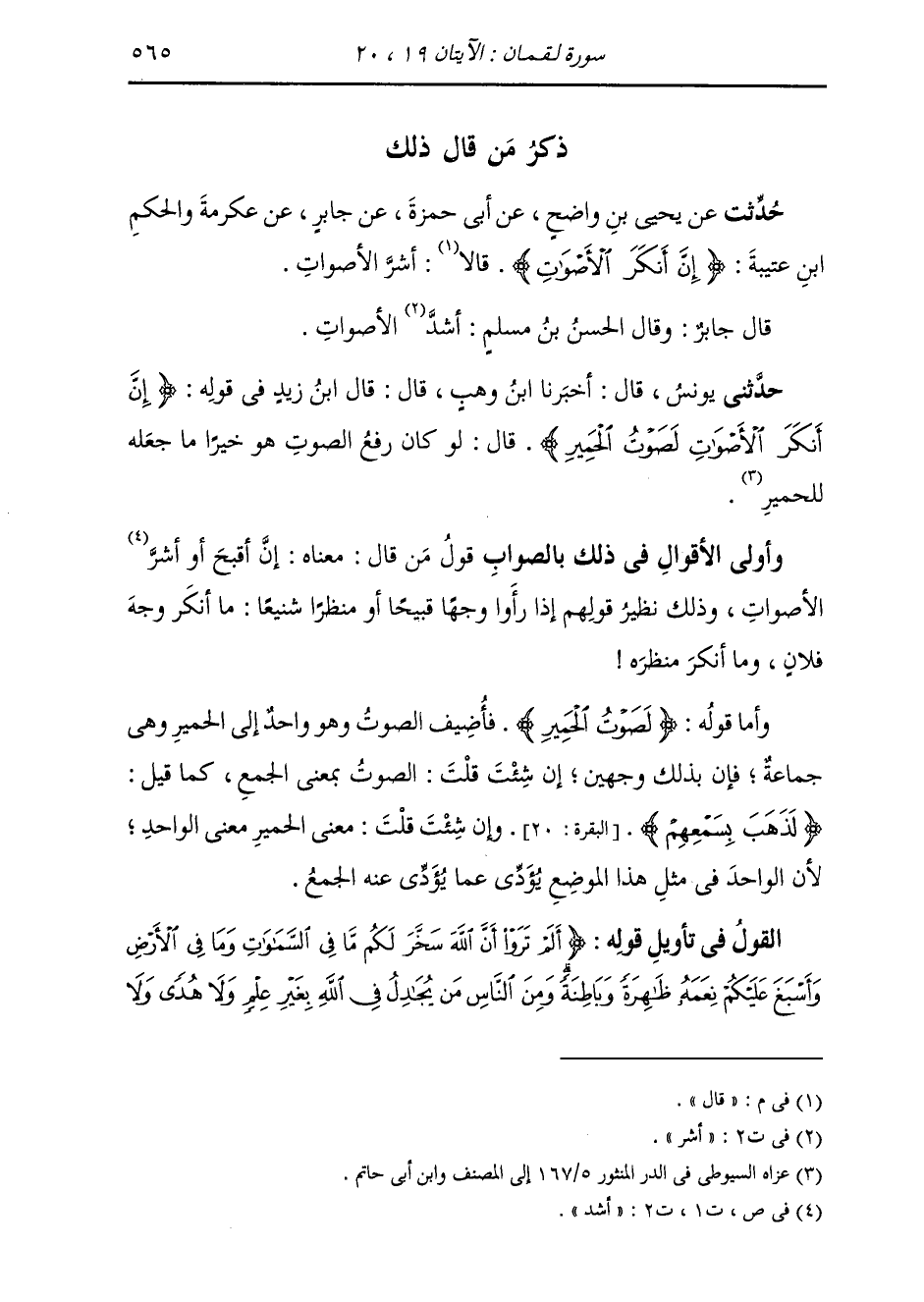 حَدَّثَنِي يُونُسُ، قَالَ: أَخْبَرَنَا ابْنُ وَهْبٍ، قَالَ: قَالَ ابْنُ زَيْدٍ، فِي قَوْلِهِ " {§إِنَّ أَنْكَرَ الْأَصْوَاتِ لَصَوْتُ الْحَمِيرِ} [لقمان: 19] قَالَ: لَوْ كَانَ رَفْعُ الصَّوْتِ هُوَ خَيْرٌ مَا جَعَلَهُ لِلْحَمِيرِ ". وَأَوْلَى الْأَقْوَالِ فِي ذَلِكَ بِالصَّوَابِ قَوْلُ مَنْ قَالَ: مَعْنَاهُ: إِنَّ أَقْبَحَ أَوْ أَشَرَّ الْأَصْوَاتِ، وَذَلِكَ نَظِيرُ قَوْلِهِمْ، إِذَا رَأَوْا وَجْهًا قَبِيحًا، أَوْ مَنْظَرًا شَنِيعًا: مَا أَنْكَرَ وَجْهَ فُلَانٍ، وَمَا أَنْكَرَ مَنْظَرَهُ. وَأَمَّا قَوْلُهُ: {لَصَوْتُ الْحَمِيرِ} [لقمان: 19] فَأُضِيفَ الصَّوْتُ وَهُوَ وَاحِدٌ إِلَى الْحَمِيرِ وَهِيَ جَمَاعَةٌ، فَإِنَّ ذَلِكَ لِوَجْهَيْنِ إِنْ شِئْتَ، قُلْتَ: الصَّوْتُ بِمَعْنَى الْجَمْعُ، كَمَا قِيلَ {لَذَهَبَ بِسَمْعِهِمْ} [البقرة: 20] وَإِنْ شِئْتَ قُلْتَ: مَعْنَى الْحَمِيرِ: مَعْنَى الْوَاحِدِ، لِأَنَّ الْوَاحِدَ فِي مِثْلِ هَذَا الْمَوْضِعِ يُؤَدِّي عَمَّا يُؤَدِّي عَنْهُ الْجَمْعُ.