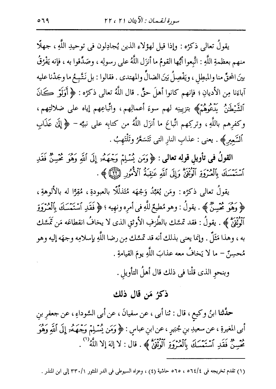 ذِكْرُ مَنْ قَالَ ذَلِكَ: حَدَّثَنَا ابْنُ وَكِيعٍ، قَالَ: ثَنَا أَبِي، عَنْ سُفْيَانَ، عَنْ أَبِي السَّوْدَاءِ، عَنْ جَعْفَرِ بْنِ أَبِي الْمُغِيرَةِ، عَنْ سَعِيدِ بْنِ جُبَيْرٍ، عَنِ ابْنِ عَبَّاسٍ، " {§وَمَنْ يُسْلِمْ وَجْهَهُ إِلَى اللَّهِ وَهُوَ مُحْسِنٌ فَقَدِ اسْتَمْسَكَ بِالْعُرْوَةِ الْوُثْقَى} [لقمان: 22] قَالَ: لَا إِلَهَ إِلَّا اللَّهُ "
