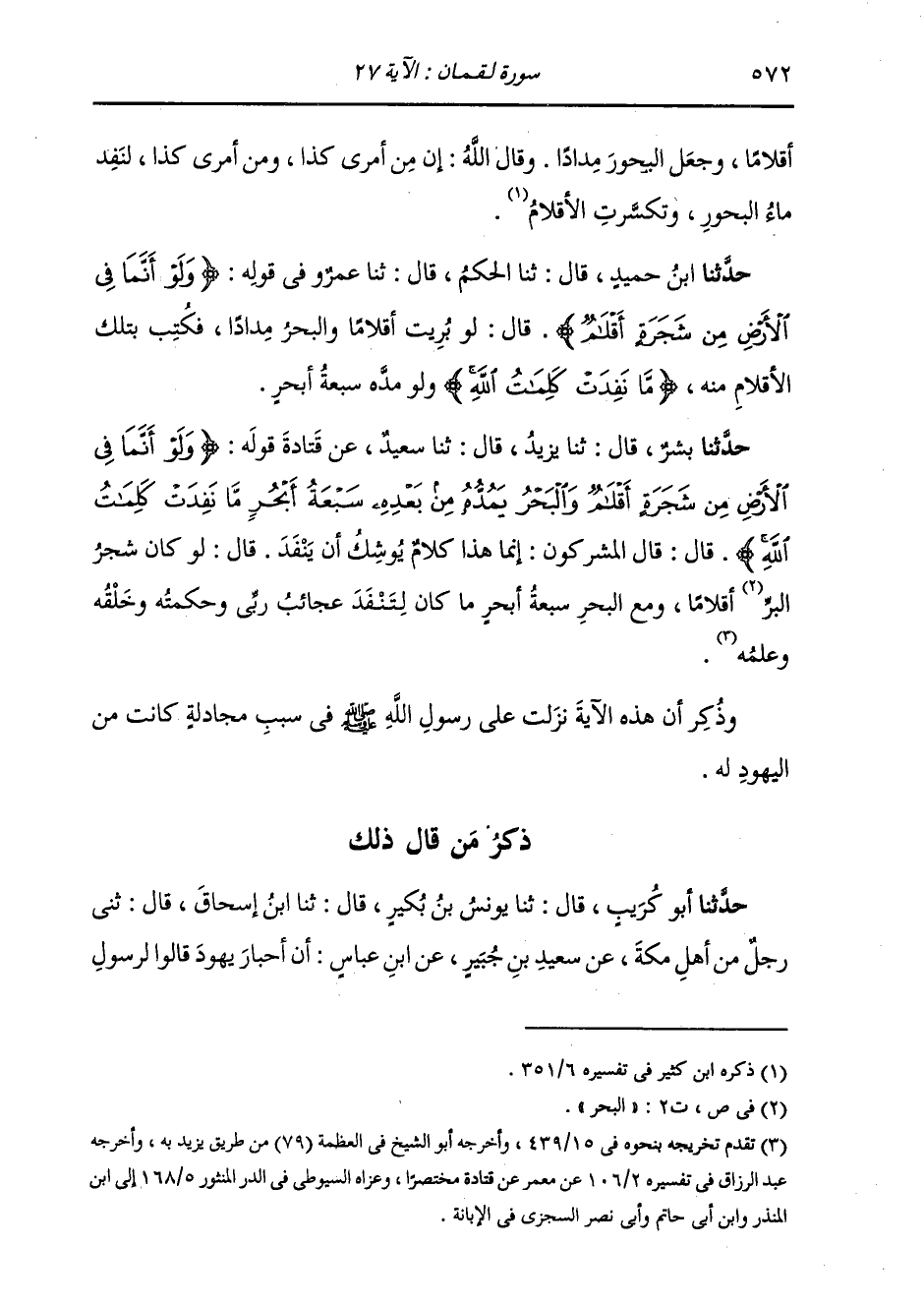 حَدَّثَنَا بِشْرٌ، قَالَ: ثَنَا يَزِيدُ، قَالَ: ثَنَا سَعِيدٌ، عَنْ قَتَادَةَ، قَوْلُهُ " {§وَلَوْ أَنَّمَا فِي الْأَرْضِ مِنْ شَجَرَةٍ أَقْلَامٌ وَالْبَحْرُ يَمُدُّهُ مِنْ بَعْدِهِ سَبْعَةُ أَبْحُرٍ مَا نَفِدَتْ كَلِمَاتُ اللَّهِ} [لقمان: 27] قَالَ: قَالَ الْمُشْرِكُونَ: إِنَّمَا هَذَا كَلَامٌ يُوشِكُ أَنْ يَنْفَدَ، قَالَ: لَوْ كَانَ شَجَرُ الْبَرِّ أَقْلَامًا، وَمَعَ الْبَحْرِ سَبْعَةُ أَبْحُرِ مَا كَانَ لِتَنْفَدَ عَجَائِبُ رَبِّي وَحِكْمَتُهُ وَخَلْقُهُ وَعِلْمُهُ ". وَذُكِرَ أَنَّ هَذِهِ الْآيَةَ نَزَلَتْ عَلَى رَسُولِ اللَّهِ صَلَّى اللهُ عَلَيْهِ وَسَلَّمَ فِي سَبَبِ مُجَادَلَةٍ كَانَتْ مِنَ الْيَهُودِ لَهُ.