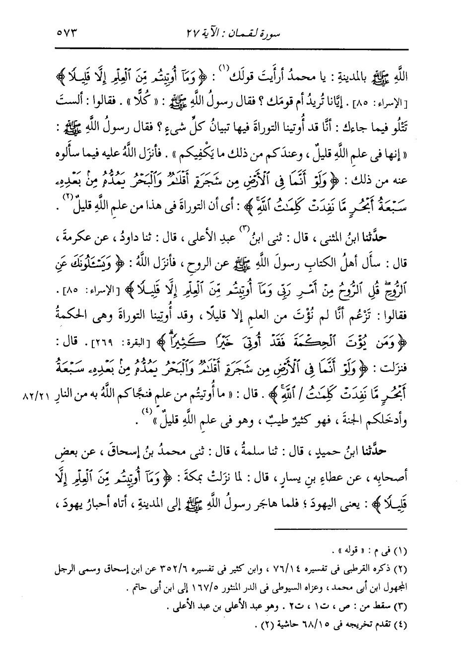 حَدَّثَنَا ابْنُ حُمَيْدٍ، قَالَ: ثَنَا سَلَمَةُ، قَالَ: ثَنِي مُحَمَّدُ بْنُ إِسْحَاقَ، عَنْ بَعْضِ أَصْحَابِهِ، عَنْ عَطَاءِ بْنِ يَسَارٍ، قَالَ: " §لَمَّا نَزَلَتْ بِمَكَّةَ {وَمَا أُوتِيتُمْ مِنَ الْعِلْمِ إِلَّا قَلِيلًا} [الإسراء: 85] يَعْنِي الْيَهُودَ؛ فَلَمَّا هَاجَرَ رَسُولَ اللَّهِ صَلَّى اللهُ عَلَيْهِ وَسَلَّمَ إِلَى الْمَدِينَةِ، أَتَاهُ أَحْبَارُ يَهُودَ، -[574]- فَقَالُوا: يَا مُحَمَّدُ أَلَمْ يَبْلُغْنَا أَنَّكَ تَقُولُ {وَمَا أُوتِيتُمْ مِنَ الْعِلْمِ إِلَّا قَلِيلًا} [الإسراء: 85] أَفَتَعْنِينَا أَمْ قَوْمَكَ؟ قَالَ: وَكُلًّا قَدْ عَنَيْتُ "، قَالُوا: فَإِنَّكَ تَتْلُو: أَنَّا قَدْ أُوتِينَا التَّوْرَاةَ، وَفِيهَا تِبْيَانُ كُلِّ شَيْءٍ، فَقَالَ رَسُولُ اللَّهِ صَلَّى اللهُ عَلَيْهِ وَسَلَّمَ: «هِيَ فِي عِلْمِ اللَّهِ قَلِيلٌ، وَقَدْ أَتَاكُمُ اللَّهُ مَا إِنْ عَمِلْتُمْ بِهِ انْتَفَعْتُمْ» ، فَأَنْزَلَ اللَّهُ {وَلَوْ أَنَّمَا فِي الْأَرْضِ مِنْ شَجَرَةٍ أَقْلَامٌ وَالْبَحْرُ يَمُدُّهُ مِنْ بَعْدِهِ سَبْعَةُ أَبْحُرٍ} [لقمان: 27] إِلَى قَوْلِهِ {إِنَّ اللَّهَ سُمَيْعٌ بَصِيرٌ} [الحج: 75] ". وَاخْتَلَفَتِ الْقُرَّاءُ فِي قِرَاءَةِ قَوْلِهِ {وَالْبَحْرُ يَمُدُّهُ مِنْ بَعْدِهِ سَبْعَةُ أَبْحُرٍ} [لقمان: 27] فَقَرَأَتْهُ عَامَّةُ قُرَّاءِ الْمَدِينَةِ وَالْكُوفَةِ: وَالْبَحْرُ رَفْعًا عَلَى الِابْتِدَاءِ، وَقَرَأَتْهُ قُرَّاءُ الْبَصْرَةِ نَصْبًا، عَطْفًا بِهِ عَلَى «مَا» فِي قَوْلِهِ: {وَلَوْ أَنَّمَا فِي الْأَرْضِ} [لقمان: 27] وَبِأَيَّتِهِمَا قَرَأَ الْقَارِئُ فَمُصِيبٌ عِنْدِي.