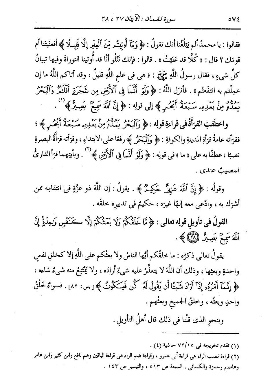 §الْقَوْلُ فِي تَأْوِيلِ قَوْلِهِ تَعَالَى: {مَا خَلْقُكُمْ وَلَا بَعْثُكُمْ إِلَّا كَنَفْسٍ وَاحِدَةٍ} [لقمان: 28] يَقُولُ تَعَالَى ذِكْرُهُ: مَا خَلْقُكُمْ أَيُّهَا النَّاسُ، وَلَا بَعْثُكُمْ عَلَى اللَّهِ إِلَّا كَخَلْقِ نَفْسٍ وَاحِدَةٍ وَبَعْثِهَا، وَذَلِكَ أَنَّ اللَّهَ لَا يَتَعَذَّرُ عَلَيْهِ شَيْءٌ أَرَادَهُ، وَلَا يَمْتَنِعُ مِنْهُ شَيْءٌ شَاءَهُ {إِنَّمَا أَمْرُهُ إِذَا أَرَادَ شَيْئًا أَنْ يَقُولَ لَهُ كُنْ فَيَكُونُ} [يس: 82] فَسَوَاءٌ خَلْقُ وَاحِدٍ وَبَعْثُهُ، وَخَلْقُ الْجَمِيعِ وَبَعْثُهُمْ. وَبِنَحْوِ الَّذِي قُلْنَا فِي ذَلِكَ قَالَ أَهْلُ التَّأْوِيلِ.