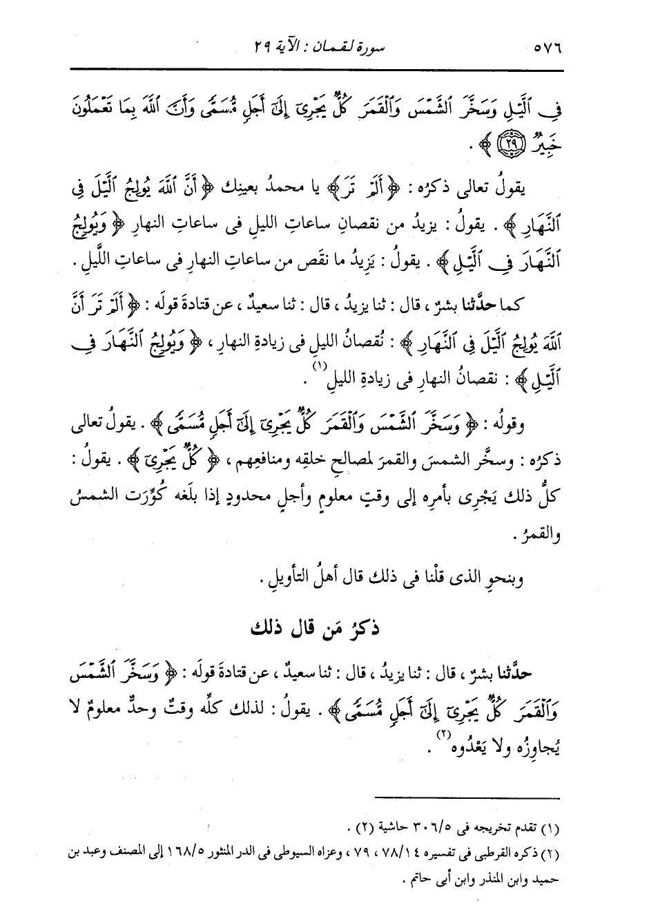 ذِكْرُ مَنْ قَالَ ذَلِكَ: حَدَّثَنَا بِشْرٌ، قَالَ: ثَنَا يَزِيدُ، قَالَ: ثَنَا سَعِيدٌ، عَنْ قَتَادَةَ، قَوْلُهُ: " {§وَسَخَّرَ الشَّمْسَ وَالْقَمَرَ كُلٌّ يَجْرِي إِلَى أَجَلٍ مُسَمًّى} [لقمان: 29] يَقُولُ: لِذَلِكَ كُلِّهِ وَقْتٌ وَحَّدٌ مَعْلُومٌ، لَا يُجَاوِزُهُ وَلَا يَعْدُوهُ "