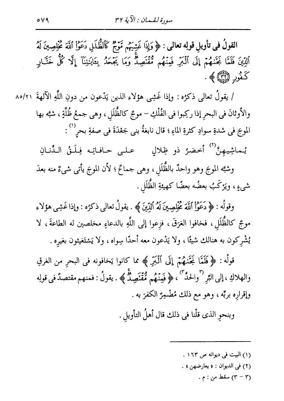 §الْقَوْلُ فِي تَأْوِيلِ قَوْلِهِ تَعَالَى: {وَإِذَا غَشِيَهُمْ مَوْجٌ كَالظُّلَلِ دَعَوُا اللَّهَ مُخْلِصِينَ لَهُ الدِّينَ، فَلَمَّا نَجَّاهُمْ إِلَى الْبِرِّ فَمِنْهُمْ مُقْتَصِدٌ} [لقمان: 32] يَقُولُ تَعَالَى ذِكْرُهُ: وَإِذَا غَشِيَ هَؤُلَاءِ الَّذِينَ يَدْعُونَ مِنْ دُونِ اللَّهِ الْآلِهَةَ وَالْأَوْثَانَ فِي الْبَحْرِ، إِذَا رَكِبُوا فِي الْفُلْكِ، مَوْجٌ كَالظُّلَلِ، وَهِيَ جَمْعُ ظُلَّةٍ، شَبَّهَ بِهَا الْمَوْجَ فِي شِدَّةِ سَوَّادِ كَثْرَةِ الْمَاءِ؛ قَالَ نَابِغَةُ بَنِي جَعْدَةَ فِي صِفَةِ بَحْرٍ: