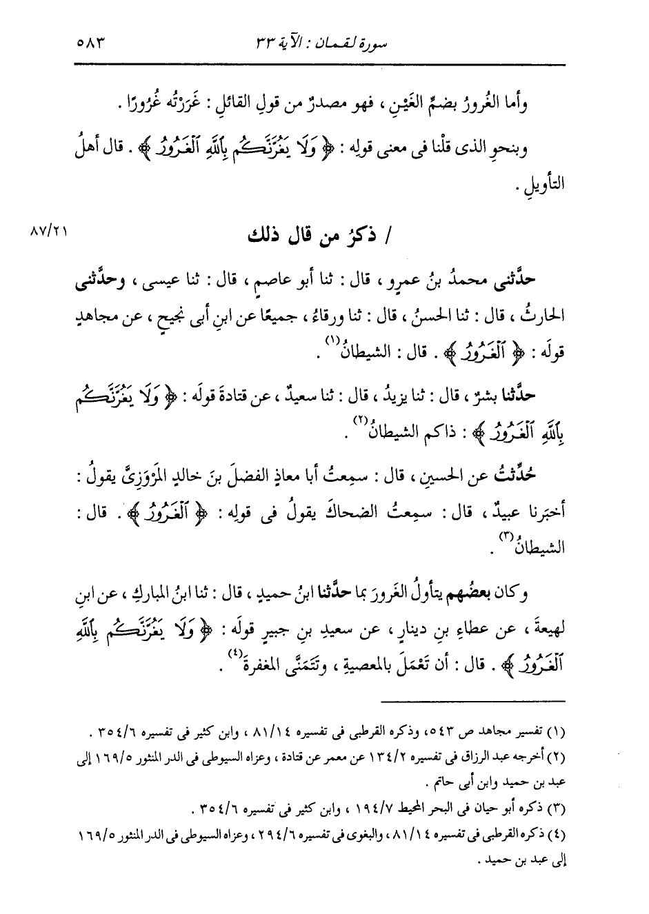 حُدِّثْتُ عَنِ الْحُسَيْنِ، قَالَ: سَمِعْتُ أَبَا مُعَاذٍ الْفَضْلَ بْنَ خَالِدٍ الْمَرْوَزِيَّ، يَقُولُ: أَخْبَرَنَا عُبَيْدٌ، قَالَ: سَمِعْتُ الضَّحَّاكَ، يَقُولُ فِي قَوْلِهِ " {§الْغَرُورُ} [لقمان: 33] قَالَ: الشَّيْطَانُ ". وَكَانَ بَعْضُهُمْ يَتَأَوَّلُ {الْغَرُورُ} [لقمان: 33] بِمَا: