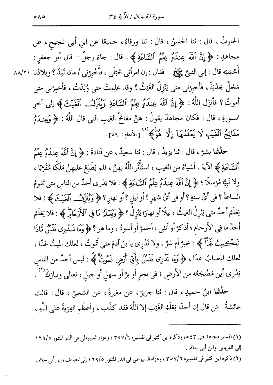 حَدَّثَنَا بِشْرٌ، قَالَ: ثنا يَزِيدُ، قَالَ: ثنا سَعِيدٌ، عَنْ قَتَادَةَ، " {§إِنَّ اللَّهَ عِنْدَهُ عِلْمُ السَّاعَةِ} [لقمان: 34] الْآيَةَ، أَشْيَاءُ مِنَ الْغَيْبِ، اسْتَأْثَرَ اللَّهُ بِهِنَّ، فَلَمْ يُطْلِعْ عَلَيْهِنَّ مَلَكًا مُقَرَّبًا، وَلَا نَبِيًّا مُرْسَلًا {إِنَّ اللَّهَ عِنْدَهُ عِلْمُ السَّاعَةِ} [لقمان: 34] فَلَا يَدْرِي أَحَدٌ مِنَ النَّاسِ مَتَى تَقُومُ السَّاعَةُ، فِي أَيِّ سَنَةٍ، أَوْ فِي أَيِّ شَهْرٍ، أَوْ لَيْلٍ، أَوْ نَهَارٍ {وَيُنَزِّلُ الْغَيْثَ} [لقمان: 34] فَلَا يَعْلَمُ أَحَدٌ مَتَى يَنْزِلُ الْغَيْثُ، لَيْلًا أَوْ نَهَارًا يَنْزِلُ، {وَيَعْلَمُ مَا فِي الْأَرْحَامِ} [لقمان: 34] فَلَا يَعْلَمُ أَحَدٌ مَا فِي الْأَرْحَامِ، أَذَكَرٌ أَوْ أُنْثَى، أَحْمَرُ أَوْ أَسْوَدُ، أَوْ مَا هُوَ؟ {وَمَا تَدْرِي نَفْسٌ مَاذَا تَكْسِبُ غَدًا} [لقمان: 34] خَيْرٌ أَمْ شَرٌّ، وَلَا تَدْرِي يَا ابْنَ آدَمَ مَتَى تَمُوتُ؟ لَعَلَّكَ الْمَيِّتُ غَدًا، لَعَلَّكَ الْمُصَابُ غَدًا {وَمَا تَدْرِي نَفْسٌ بِأَيِّ أَرْضٍ تَمُوتُ} [لقمان: 34] لَيْسَ أَحَدٌ مِنَ النَّاسِ يَدْرِي أَيْنَ مَضْجَعُهُ مِنَ الْأَرْضِ، فِي بَحْرٍ أَوْ بَرٍّ، أَوْ سَهْلٍ، أَوْ جَبَلٍ، تَعَالَى وَتَبَارَكَ "