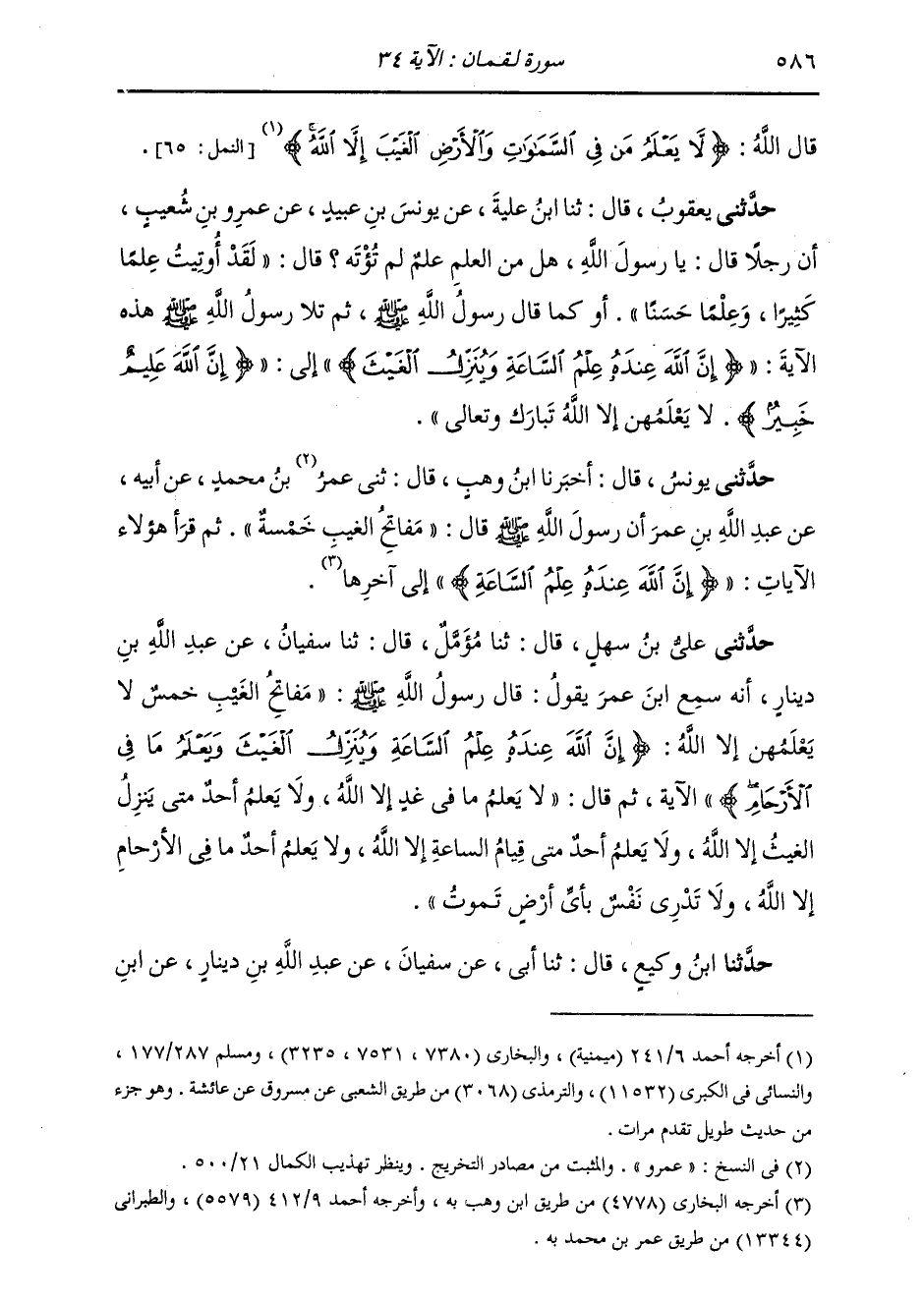 حَدَّثَنَا ابْنُ وَكِيعٍ قَالَ: ثنا أَبِي، عَنْ سُفْيَانَ، عَنْ عَبْدِ اللَّهِ بْنِ دِينَارٍ، عَنِ ابْنِ -[587]- عُمَرَ قَالَ: قَالَ رَسُولُ اللَّهِ صَلَّى اللهُ عَلَيْهِ وَسَلَّمَ: " §مَفَاتِحُ الْغَيْبِ خَمْسٌ لَا يَعْلَمُهَا إِلَّا اللَّهُ: {إِنَّ اللَّهَ عِنْدَهُ عِلْمُ السَّاعَةِ، وَيُنَزِّلُ الْغَيْثَ، وَيَعْلَمُ مَا فِي الْأَرْحَامِ، وَمَا تَدْرِي نَفْسٌ مَاذَا تَكْسِبُ غَدًا، وَمَا تَدْرِي نَفْسٌ بِأَيِّ أَرْضٍ تَمُوتُ، إِنَّ اللَّهَ عَلِيمٌ خَبِيرٌ} [لقمان: 34] "