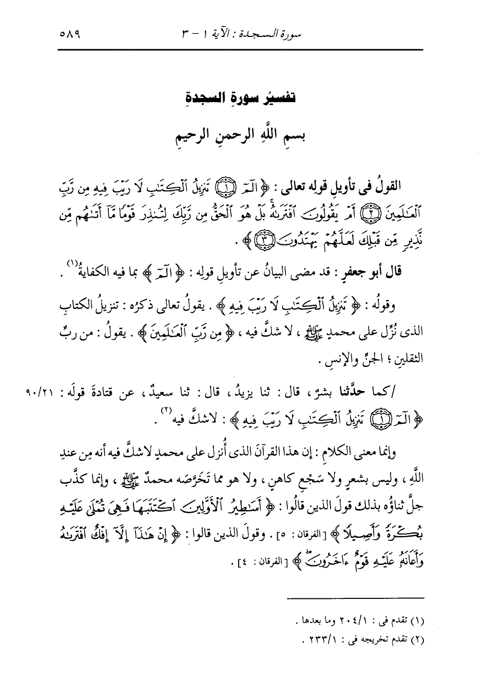 حَدَّثَنَا بِشْرٌ قَالَ: ثنا يَزِيدُ قَالَ: ثنا سَعِيدٌ، عَنْ قَتَادَةَ: قَوْلُهُ: " {§الم تَنْزِيلُ الْكِتَابِ لَا رَيْبَ فِيهِ} [السجدة: 2] لَا شَكَّ فِيهِ ". وَإِنَّمَا مَعْنَى الْكَلَامِ: إِنَّ هَذَا الْقُرْآنَ الَّذِي أُنْزِلَ عَلَى مُحَمَّدٍ صَلَّى اللهُ عَلَيْهِ وَسَلَّمَ لَا شَكَّ فِي أَنَّهُ مِنْ عِنْدِ اللَّهِ، وَلَيْسَ بِشَعْرٍ وَلَا سَجْعِ كَاهِنٍ، وَلَا هُوَ مِمَّا تَخَرَّصَهُ مُحَمَّدٌ صَلَّى اللهُ عَلَيْهِ وَسَلَّمَ، وَإِنَّمَا كَذَّبَ جَلَّ ثَنَاؤُهُ بِذَلِكَ قَوْلَ الَّذِينَ قَالُوا: {أَسَاطِيرُ الْأَوَّلِينَ اكْتَتَبَهَا فَهِيَ تُمْلَى عَلَيْهِ بَكْرَةً وَأَصِيلًا} [الفرقان: 5] ، وَقَوْلَ الَّذِينَ قَالُوا: {إِنْ هَذَا إِلَّا إِفْكٌ افْتَرَاهُ وَأَعَانَهُ عَلَيْهِ قَوْمٌ آخَرُونَ} [الفرقان: 4]