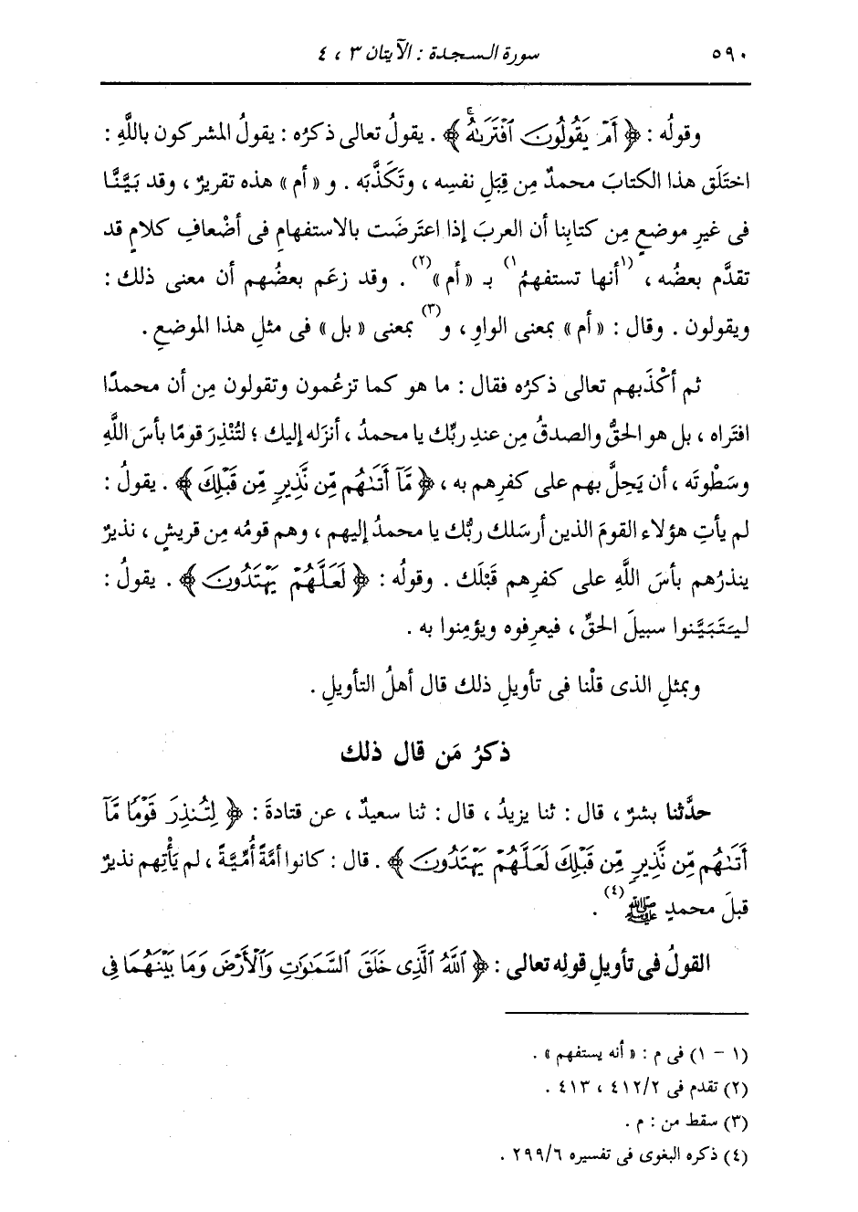 ذِكْرُ مَنْ قَالَ ذَلِكَ: حَدَّثَنَا بِشْرٌ، قَالَ: ثنا يَزِيدُ، قَالَ: ثنا سَعِيدٌ، عَنْ قَتَادَةَ، " {§لِتُنْذِرَ قَوْمًا مَا أَتَاهُمْ مِنْ نَذِيرٍ مِنْ قَبْلِكَ لَعَلَّهُمْ يَهْتَدُونَ} [السجدة: 3] قَالَ: كَانُوا أُمَّةً أُمِّيَّةً، لَمْ يَأْتِهِمْ نَذِيرٌ قَبْلَ مُحَمَّدٍ صَلَّى اللهُ عَلَيْهِ وَسَلَّمَ "