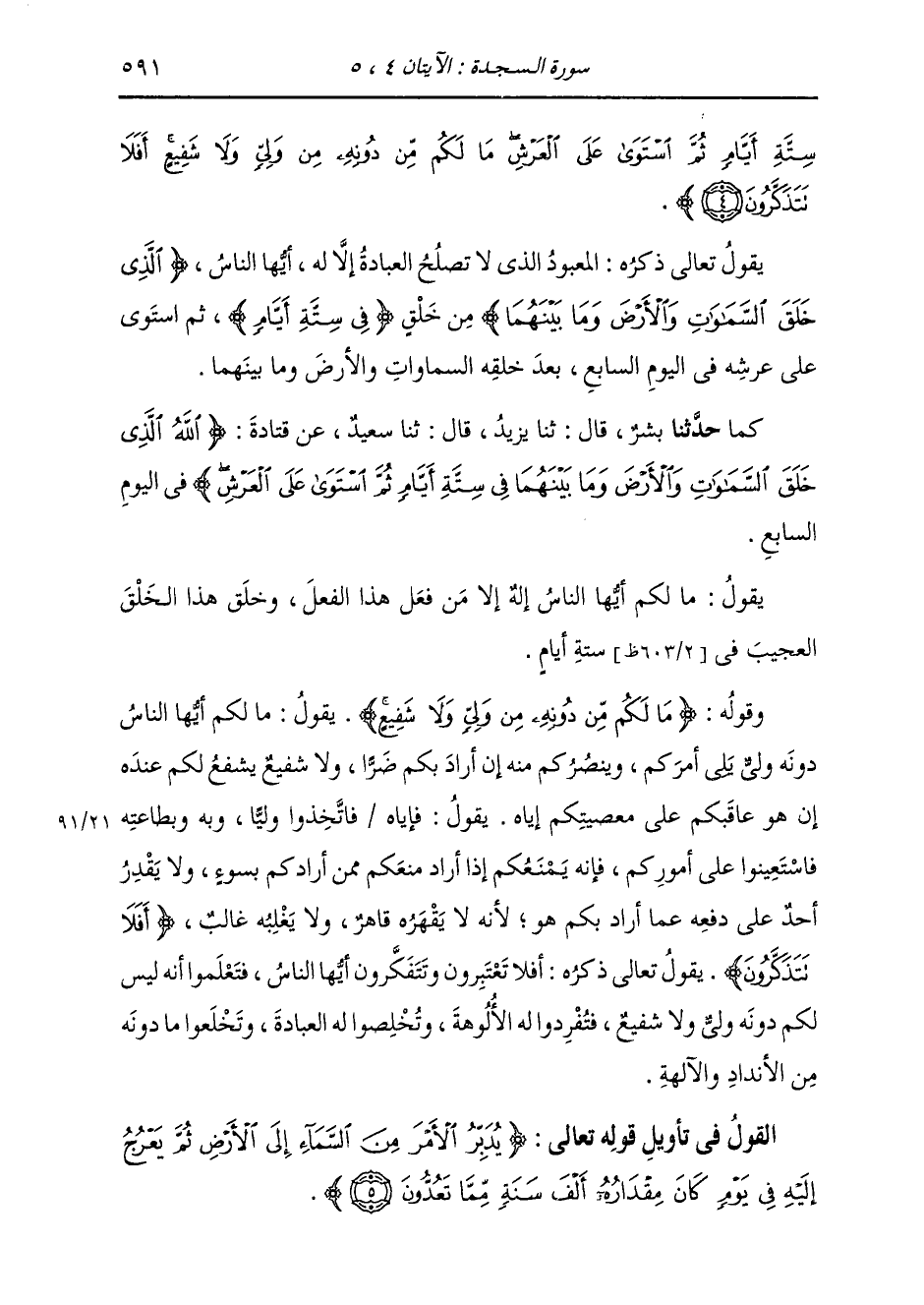 حَدَّثَنَا بِشْرٌ، قَالَ: ثنا يَزِيدُ، قَالَ: ثنا سَعِيدٌ، عَنْ قَتَادَةَ، " {§اللَّهُ الَّذِي خَلَقَ السَّمَوَاتِ وَالْأَرْضَ وَمَا بَيْنَهُمَا فِي سِتَّةِ أَيَّامٍ ثُمَّ اسْتَوَى عَلَى الْعَرْشِ} فِي الْيَوْمِ السَّابِعِ. يَقُولُ: مَا لَكُمْ أَيُّهَا النَّاسُ إِلَهٌ إِلَّا مَنْ فَعَلَ هَذَا الْفِعْلَ، وَخَلَقَ هَذَا الْخَلْقَ الْعَجِيبَ فِي سِتَّةِ أَيَّامٍ "