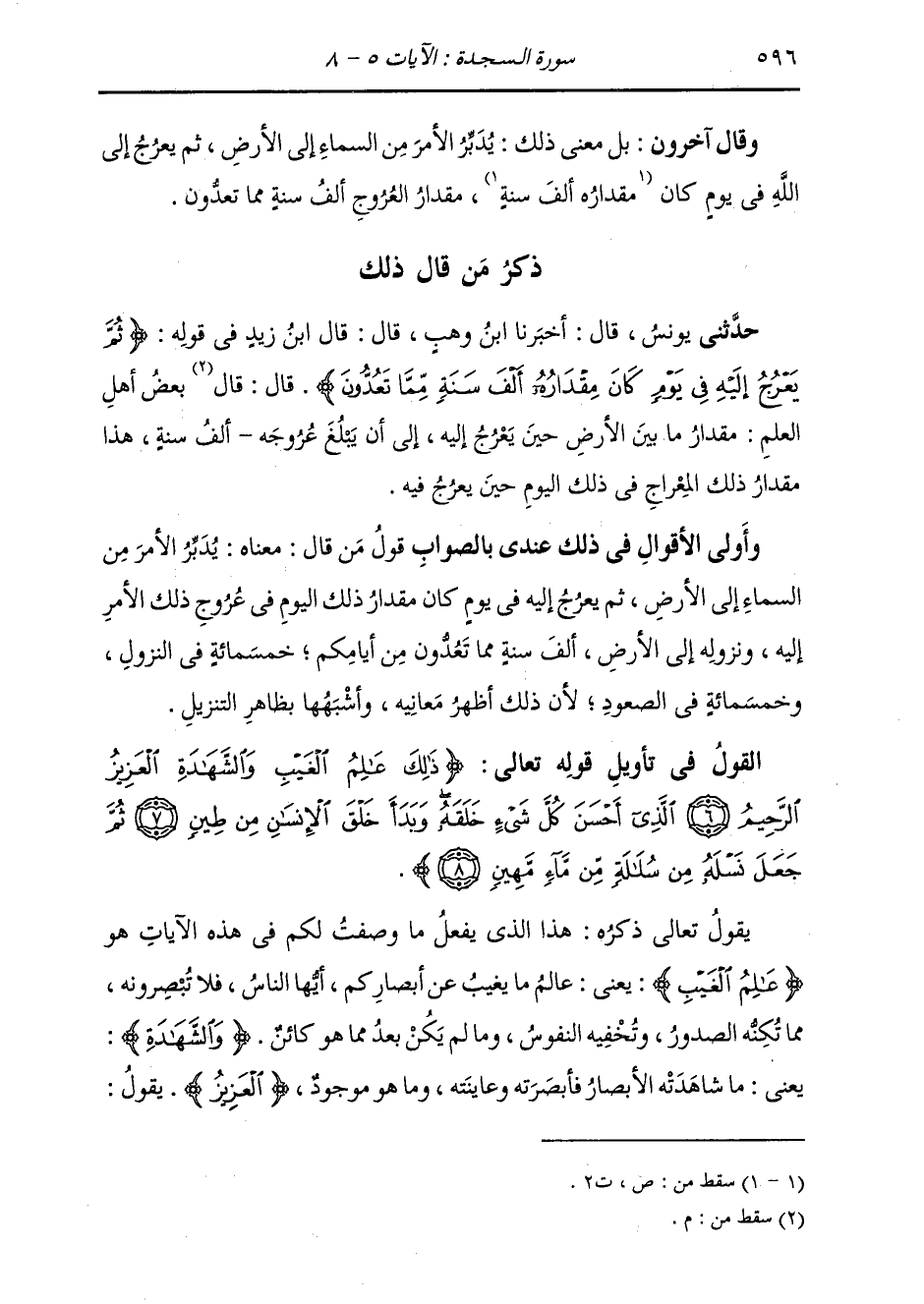 ذِكْرُ مَنْ قَالَ ذَلِكَ: حَدَّثَنِي يُونُسُ، قَالَ: أَخْبَرَنَا ابْنُ وَهْبٍ، قَالَ: قَالَ: قَالَ ابْنُ زَيْدٍ فِي قَوْلِهِ: " {§ثُمَّ يَعْرُجُ إِلَيْهِ فِي يَوْمٍ كَانَ مِقْدَارُهُ أَلْفَ سَنَةٍ مِمَّا تَعُدُّونَ} [السجدة: 5] قَالَ بَعْضُ أَهْلِ الْعِلْمِ: مِقْدَارُ مَا بَيْنَ الْأَرْضِ حِينَ يُعْرَجُ إِلَيْهِ إِلَى أَنْ يَبْلُغَ عُرُوجَهُ أَلْفُ سَنَةٍ، هَذَا مِقْدَارُ ذَلِكَ الْمِعْرَاجِ فِي ذَلِكَ الْيَوْمِ حِينَ يَعْرُجُ فِيهِ ". وَأَوْلَى الْأَقْوَالِ فِي ذَلِكَ عِنْدِي بِالصَّوَابِ قَوْلُ مَنْ قَالَ: مَعْنَاهُ: يُدَبِّرُ الْأَمْرَ مِنَ السَّمَاءِ إِلَى الْأَرْضِ، ثُمَّ يَعْرُجُ إِلَيْهِ فِي يَوْمٍ، كَانَ مِقْدَارُ ذَلِكَ الْيَوْمِ فِي عُرُوجِ ذَلِكَ الْأَمْرِ إِلَيْهِ وَنُزُولِهِ إِلَى الْأَرْضِ أَلْفَ سَنَةٍ مِمَّا تَعُدُّونَ مِنْ أَيَّامِكُمْ، خَمْسُ مِائَةٍ فِي النُّزُولِ، وَخَمْسُ مِائَةٍ فِي الصَّعُودِ، لِأَنَّ ذَلِكَ أَظْهَرُ مَعَانِيهِ، وَأَشْبَهُهَا بِظَاهِرِ التَّنْزِيلِ.