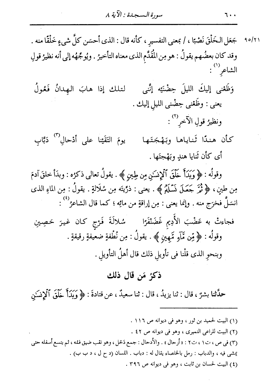§وَقَوْلُهُ: {وَبَدَأَ خَلْقَ الْإِنْسَانِ مِنْ طِينٍ} [السجدة: 7] يَقُولُ تَعَالَى ذِكْرُهُ: وَبَدَأَ خَلْقَ آدَمَ مِنْ طِينٍ {ثُمَّ جَعَلَ نَسْلَهُ} [السجدة: 8] يَعْنِي ذُرِّيَّتَهُ {مِنْ سُلَالَةٍ} [المؤمنون: 12] يَقُولُ: مِنَ الْمَاءِ الَّذِي انْسَلَّ فَخَرَجَ مِنْهُ، وَإِنَّمَا يَعْنِي مِنْ إِرَاقَةٍ مِنْ مَائِهِ، كَمَا قَالَ الشَّاعِرُ: