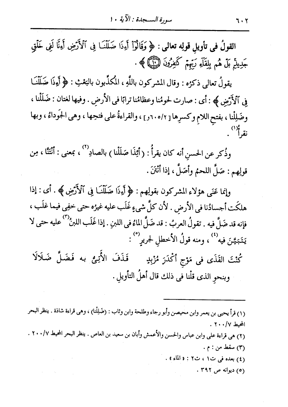 §الْقَوْلُ فِي تَأْوِيلِ قَوْلِهِ تَعَالَى: {وَقَالُوا أَئِذَا ضَلَلْنَا فِي الْأَرْضِ أَئِنَّا لَفِي خَلْقٍ جَدِيدٍ} [السجدة: 10] يَقُولُ تَعَالَى ذِكْرُهُ: وَقَالَ الْمُشْرِكُونَ بِاللَّهِ، الْمُكَذِّبُونَ بِالْبَعْثِ: {أَئِذَا ضَلَلْنَا فِي الْأَرْضِ} [السجدة: 10] أَيْ صَارَتْ لُحُومُنَا وَعِظَامُنَا تُرَابًا فِي الْأَرْضِ، وَفِيهَا لُغَتَانِ: ضَلَلْنَا، وَضَلِلْنَا، بِفَتْحِ اللَّامِ وَكَسْرِهَا، وَالْقِرَاءَةُ عَلَى فَتْحِهَا، وَهِيَ الْجَوْدَاءُ، وَبِهَا نَقْرَأُ، وَذُكِرَ عَنِ الْحَسَنِ أَنَّهُ كَانَ يَقْرَأُ: (أَئِذَا صَلَلْنَا) ، بِالصَّادِ، بِمَعْنَى: أَنْتَنَّا، مِنْ قَوْلِنَا: صَلَّ اللَّحْمُ وَأَصَلَّ: إِذَا أَنْتَنَ، وَإِنَّمَا عَنَى هَؤُلَاءِ الْمُشْرِكُونَ بِقَوْلِهِمْ: {أَئِذَا ضَلَلْنَا فِي الْأَرْضِ} [السجدة: 10] أَيْ إِذَا هَلَكَتْ أَجْسَادُنَا فِي الْأَرْضِ، لِأَنَّ كُلَّ شَيْءٍ غَلَبَ عَلَيْهِ غَيْرُهُ حَتَّى خَفِيَ فِيمَا غَلَبَ، فَإِنَّهُ قَدْ ضَلَّ فِيهِ، تَقُولُ الْعَرَبُ: قَدْ ضَلَّ الْمَاءُ فِي اللَّبَنِ: إِذَا غَلَبَ عَلَيْهِ حَتَّى لَا يَتَبَيَّنَ فِيهِ، وَمِنْهُ قَوْلُ الْأَخْطَلِ لِجَرِيرٍ: