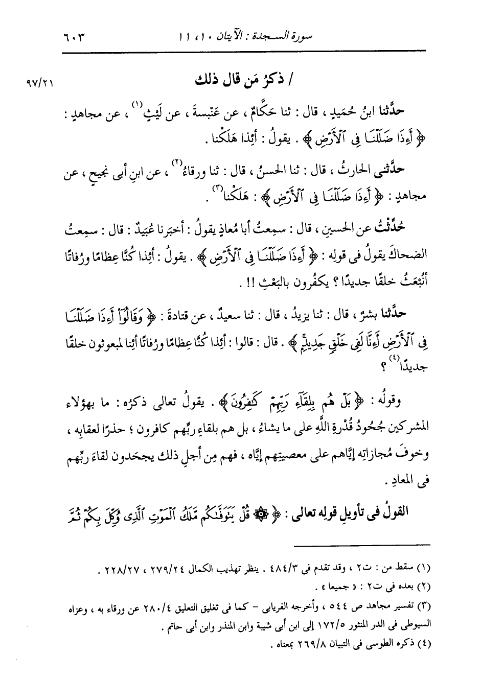 ذِكْرُ مَنْ قَالَ ذَلِكَ: حَدَّثَنَا ابْنُ حُمَيْدٍ، قَالَ: ثنا حَكَّامٌ، عَنْ عَنْبَسَةَ، عَنْ لَيْثٍ، عَنْ مُجَاهِدٍ، " {§أَئِذَا ضَلَلْنَا فِي الْأَرْضِ} [السجدة: 10] يَقُولُ: أَئِذَا هَلَكْنَا ". حَدَّثَنِي الْحَارِثُ قَالَ: ثنا الْحَسَنُ قَالَ: ثنا وَرْقَاءُ، جَمِيعًا، عَنِ ابْنِ أَبِي نَجِيحٍ، عَنْ مُجَاهِدٍ {أَئِذَا ضَلَلْنَا فِي الْأَرْضِ} [السجدة: 10] هَلَكْنَا
