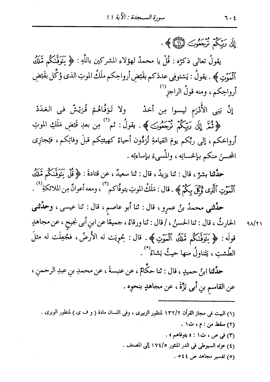 حَدَّثَنَا بِشْرٌ، قَالَ: ثنا يَزِيدُ، قَالَ: ثنا سَعِيدٌ، عَنْ قَتَادَةَ، " {§قُلْ يَتَوَفَّاكُمْ مَلَكُ الْمَوْتِ الَّذِي وُكِّلَ بِكُمْ} [السجدة: 11] قَالَ: مَلَكُ الْمَوْتِ يَتَوَفَّاكُمْ، وَمَعَهُ أَعْوَانٌ مِنَ الْمَلَائِكَةِ "