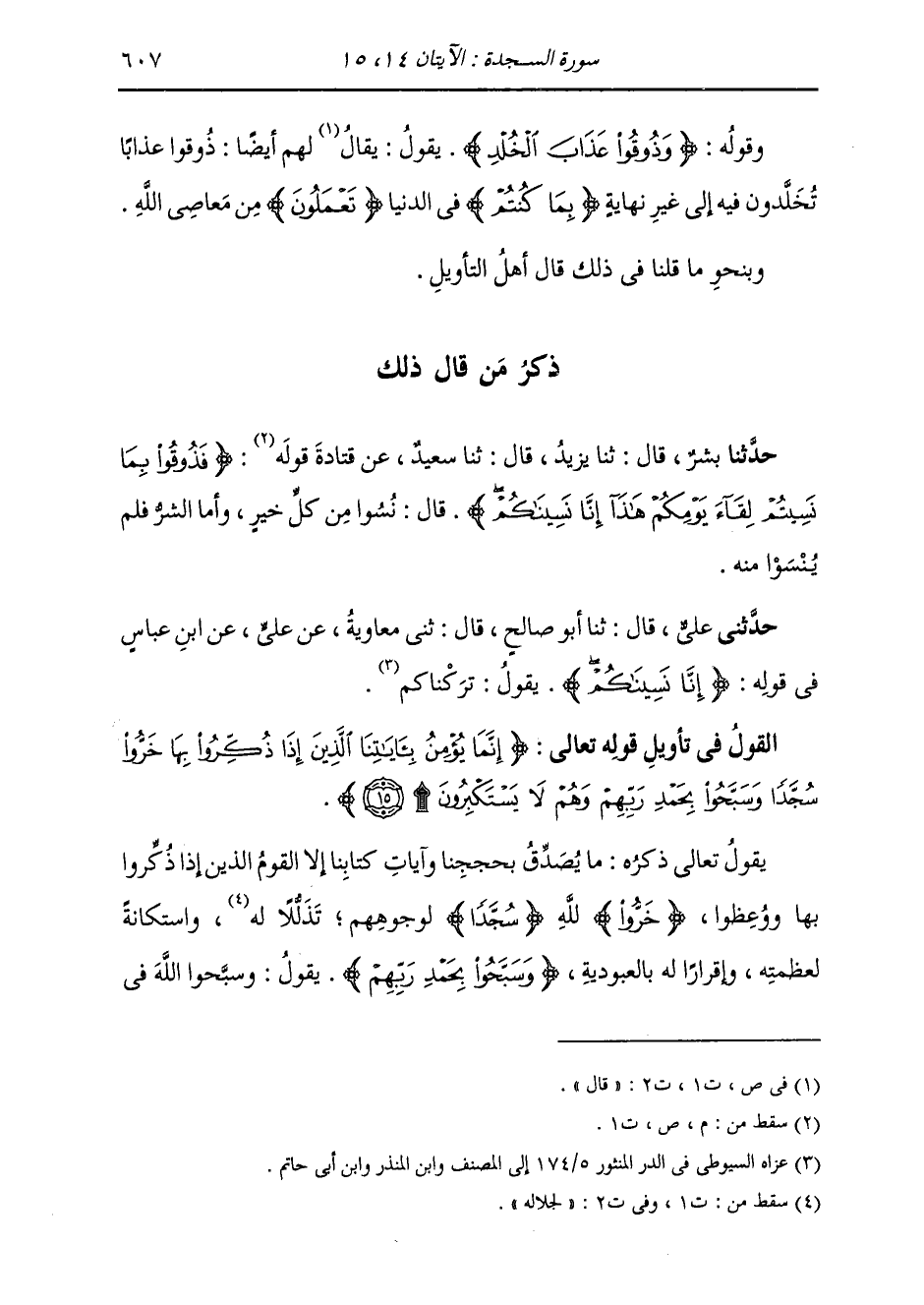 §الْقَوْلُ فِي تَأْوِيلِ قَوْلِهِ تَعَالَى: {إِنَّمَا يُؤْمِنُ بِآيَاتِنَا الَّذِينَ إِذَا ذُكِّرُوا بِهَا خَرُّوا سُجَّدًا وَسَبَّحُوا بِحَمْدِ رَبِّهِمْ وَهُمْ لَا يَسْتَكْبِرُونَ} [السجدة: 15] يَقُولُ تَعَالَى ذِكْرُهُ: مَا يُصَدِّقُ بِحُجَجِنَا وَآيَاتِ كِتَابِنَا إِلَّا الْقَوْمُ الَّذِينَ إِذَا ذُكِّرُوا بِهَا وَوُعِظُوا {خَرُّوا} [مريم: 58] لِلَّهِ {سُجَّدًا} [البقرة: 58] لِوُجُوهِهِمْ، تَذَلُّلًا لَهُ، وَاسْتِكَانَةً لِعَظَمَتِهِ، وَإِقْرَارًا لَهُ بِالْعُبُودِيَّةِ {وَسَبَّحُوا بِحَمْدِ رَبِّهِمْ} [السجدة: 15] يَقُولُ: وَسَبَّحُوا اللَّهَ فِي
