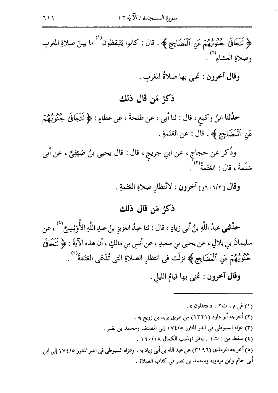 ذِكْرُ مَنْ قَالَ ذَلِكَ: حَدَّثَنِي عَبْدُ اللَّهِ بْنُ أَبِي زِيَادٍ، قَالَ: ثنا عَبْدُ الْعَزِيزِ بْنُ عَبْدِ اللَّهِ الْأُوَيْسِيُّ، عَنْ سُلَيْمَانَ بْنِ بِلَالٍ، عَنْ يَحْيَى بْنِ سَعِيدٍ، عَنْ أَنَسِ بْنِ مَالِكٍ، أَنَّ §هَذِهِ الْآيَةَ: {تَتَجَافَى جُنُوبُهُمْ عَنِ الْمَضَاجِعِ} [السجدة: 16] نَزَلَتْ فِي انْتِظَارِ الصَّلَاةِ الَّتِي تُدْعَى الْعَتَمَةَ ". وَقَالَ آخَرُونَ: عَنَى بِهَا قِيَامَ اللَّيْلِ.