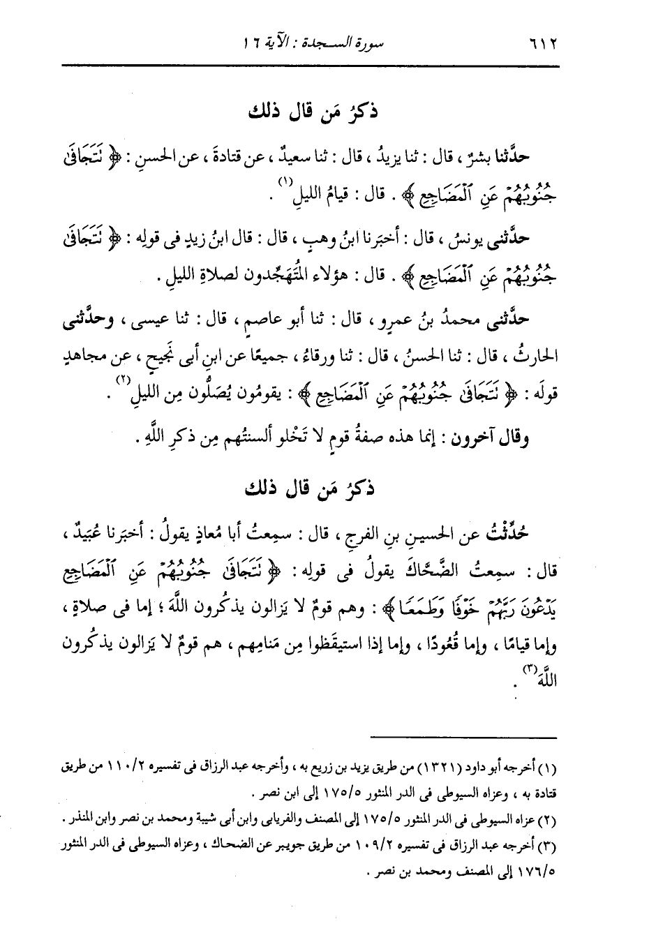 ذِكْرُ مَنْ قَالَ ذَلِكَ: حَدَّثَنَا بِشْرٌ، قَالَ: ثنا يَزِيدُ، قَالَ: ثنا سَعِيدٌ، عَنْ قَتَادَةَ، عَنِ الْحَسَنِ، " {§تَتَجَافَى جُنُوبُهُمْ عَنِ الْمَضَاجِعِ} [السجدة: 16] ، قَالَ: قِيَامُ اللَّيْلِ "