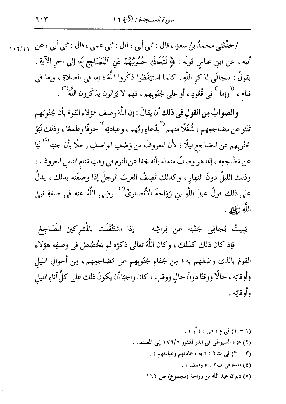 حَدَّثَنِي مُحَمَّدُ بْنُ سَعْدٍ، قَالَ: ثني أَبِي قَالَ: ثني عَمِّي قَالَ: ثني أَبِي، عَنْ أَبِيهِ، عَنِ ابْنِ عَبَّاسٍ: قَوْلُهُ " {§تَتَجَافَى جُنُوبُهُمْ عَنِ الْمَضَاجِعِ} [السجدة: 16] ، إِلَى آخِرِ الْآيَةِ يَقُولُ: تَتَجَافَى لِذِكْرِ اللَّهِ، كُلَّمَا اسْتَيْقَظُوا ذَكَرُوا اللَّهَ، إِمَّا فِي الصَّلَاةِ، وَإِمَّا فِي قِيَامٍ، أَوْ فِي قُعُودٍ، أَوْ عَلَى جُنُوبِهِمْ، فَهُمْ لَا يَزَالُونَ يَذْكُرُونَ اللَّهَ ". وَالصَّوَابُ مِنَ الْقَوْلِ فِي ذَلِكَ أَنْ يُقَالَ: إِنَّ اللَّهَ وَصَفَ هَؤُلَاءِ الْقَوْمَ بِأَنَّ جُنُوبَهُمْ تَنْبُو عَنْ مَضَاجِعِهِمْ، شُغْلًا مِنْهُمْ بِدُعَاءِ رَبِّهِمْ وَعِبَادَتِهِ خَوْفًا وَطَمَعًا، وَذَلِكَ نُبُوُّ جُنُوبِهِمْ عَنِ الْمَضَاجِعِ لَيْلًا، لِأَنَّ الْمَعْرُوفَ مِنْ وَصْفِ الْوَاصِفِ رَجُلًا بِأَنَّ جَنْبَهُ نَبَا عَنْ مَضْجَعِهِ، إِنَّمَا هُوَ وَصْفٌ مِنْهُ لَهُ بِأَنَّهُ جَفَا عَنِ النَّوْمِ فِي وَقْتِ مَنَامِ النَّاسِ الْمَعْرُوفِ، وَذَلِكَ اللَّيْلُ دُونَ النَّهَارِ، وَكَذَلِكَ تَصِفُ الْعَرَبُ الرَّجُلَ إِذَا وَصَفَتْهُ بِذَلِكَ، يَدُلُّ عَلَى ذَلِكَ قَوْلُ عَبْدِ اللَّهِ بْنِ رَوَاحَةَ الْأَنْصَارِيِّ رَضِيَ اللَّهُ عَنْهُ فِي صِفَةِ نَبِيِّ اللَّهِ صَلَّى اللهُ عَلَيْهِ وَسَلَّمَ: