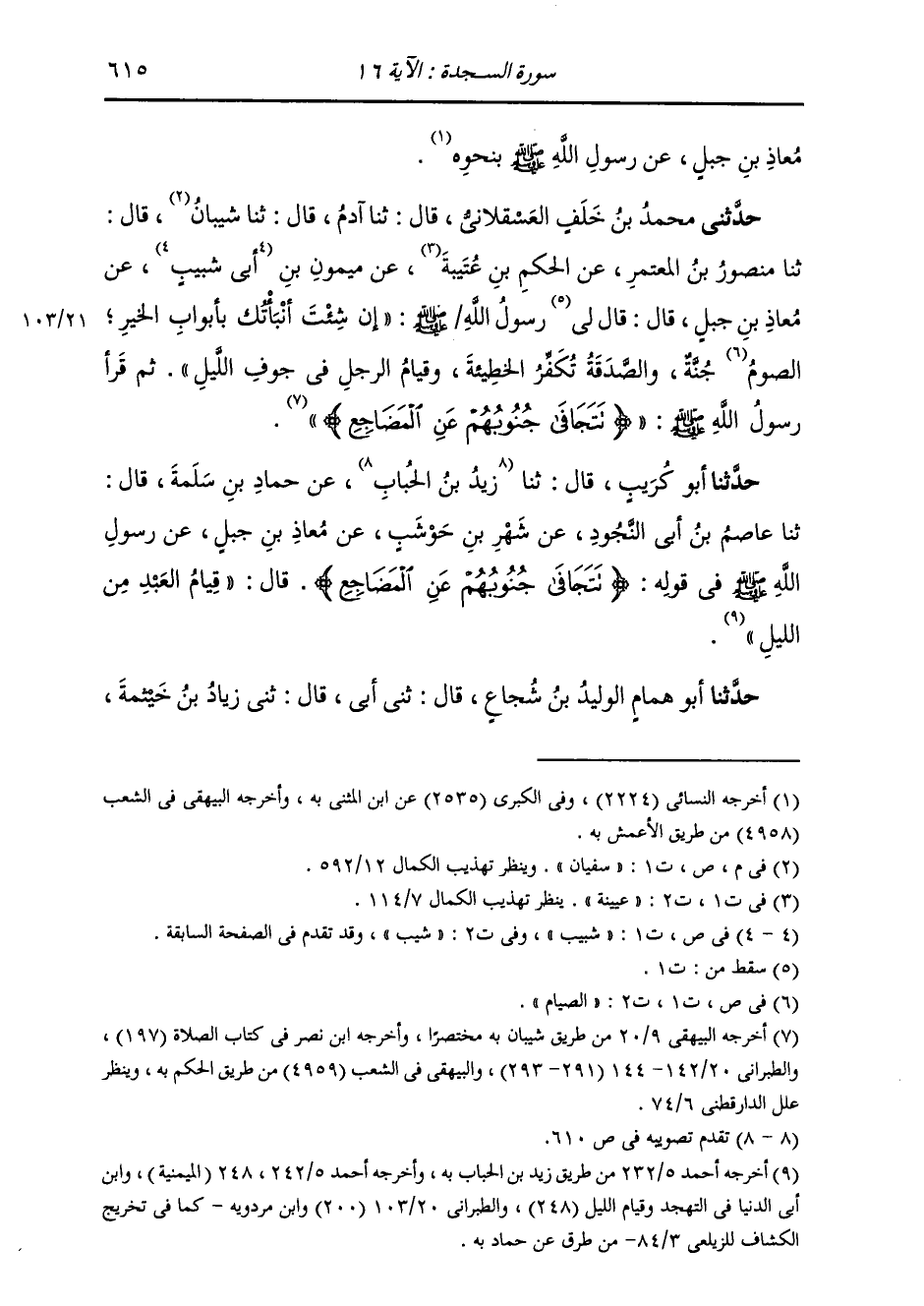 حَدَّثَنَا أَبُو كُرَيْبٍ قَالَ: ثنا يَزِيدُ بْنُ حَيَّانَ، عَنْ حَمَّادِ بْنِ سَلَمَةَ قَالَ: ثنا عَاصِمُ بْنُ أَبِي النَّجُودِ، عَنْ شَهْرِ بْنِ حَوْشَبٍ، عَنْ مُعَاذِ بْنِ جَبَلٍ، عَنْ رَسُولِ اللَّهِ صَلَّى اللهُ عَلَيْهِ وَسَلَّمَ، فِي قَوْلِهِ {§تَتَجَافَى جُنُوبُهُمْ عَنِ الْمَضَاجِعِ} [السجدة: 16] قَالَ: «قِيَامُ الْعَبْدِ مِنَ اللَّيْلِ»