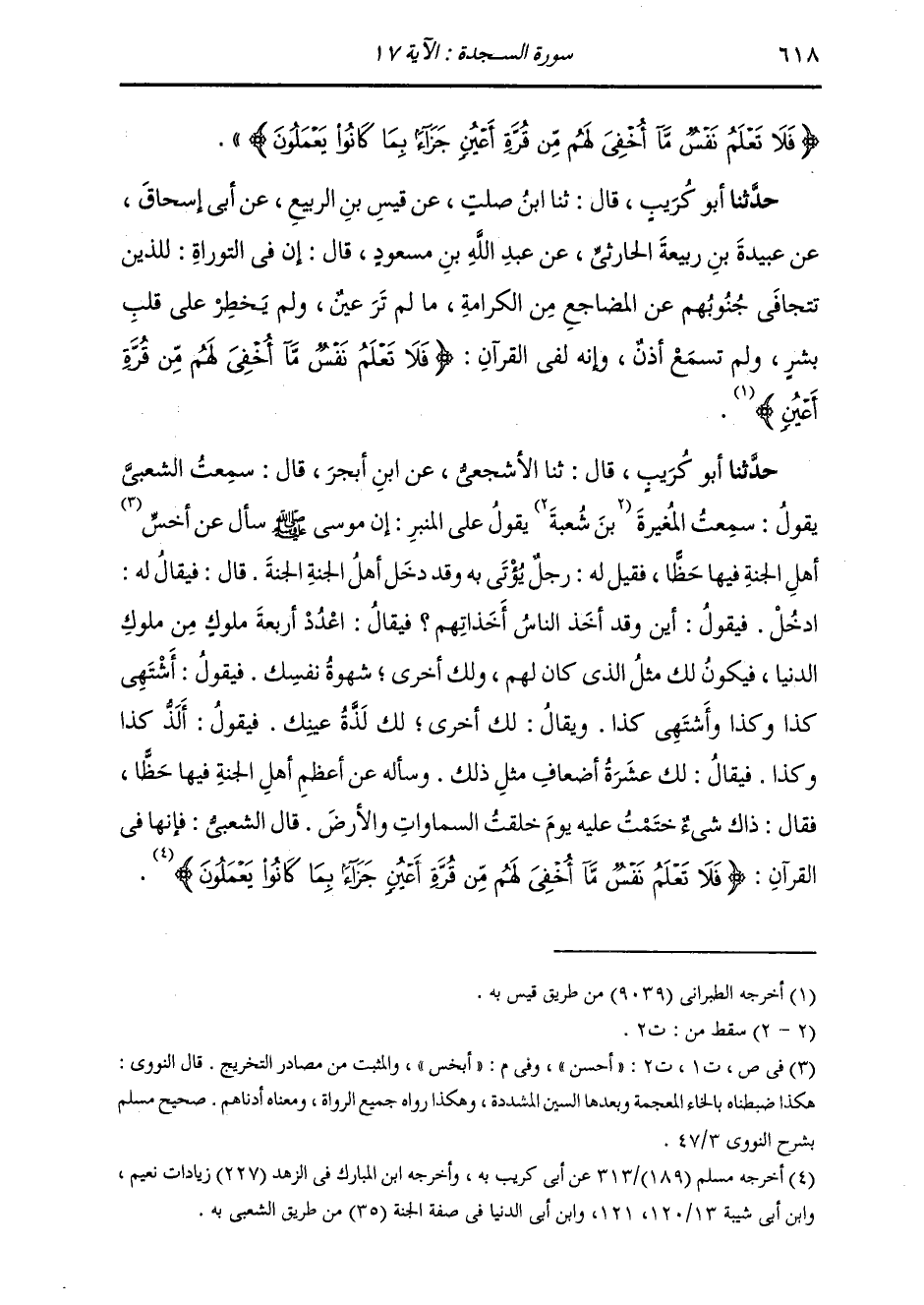 حَدَّثَنَا أَبُو كُرَيْبٍ قَالَ: ثنا ابْنُ صَلْتٍ، عَنْ قَيْسِ بْنِ الرَّبِيعِ، عَنْ أَبِي إِسْحَاقَ، عَنْ عُبَيْدَةَ بْنِ رَبِيعَةَ الْحَارِثِيِّ، عَنْ عَبْدِ اللَّهِ بْنِ مَسْعُودٍ قَالَ: إِنَّ فِي التَّوْرَاةِ: §لِلَّذِينَ تَتَجَافَى جُنُوبُهُمْ عَنِ الْمَضَاجِعِ مِنَ الْكَرَامَةِ مَا لَمْ تَرَ عَيْنٌ، وَلَمْ يَخْطِرْ عَلَى قَلْبِ بَشَرٍ، وَلَمْ تَسْمَعْ أُذُنٌ، وَإِنَّهُ لَفِي الْقُرْآنِ {فَلَا تَعْلَمُ نَفْسٌ مَا أُخْفِيَ لَهُمْ مِنْ قُرَّةِ أَعْيُنٍ} [السجدة: 17] "