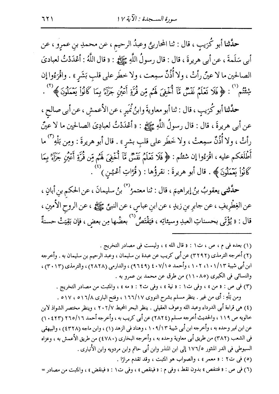حَدَّثَنَا أَبُو كُرَيْبٍ قَالَ: ثنا أَبُو مُعَاوِيَةَ وَابْنُ نُمَيْرٍ، عَنِ الْأَعْمَشِ، عَنْ أَبِي صَالِحٍ، عَنْ أَبِي هُرَيْرَةَ قَالَ: قَالَ رَسُولُ اللَّهِ صَلَّى اللهُ عَلَيْهِ وَسَلَّمَ: «§أَعْدَدْتُ لِعِبَادِيَ الصَّالِحِينَ، مَا لَا عَيْنٌ رَأَتْ، وَلَا أُذُنٌ سَمِعَتْ، وَلَا خَطَرَ عَلَى قَلْبِ بَشَرٍ» . قَالَ أَبُو هُرَيْرَةَ: وَمَنْ بَلِهَ مَا أَطْلَعَكُمْ عَلَيْهِ، اقْرَءُوا إِنْ شِئْتُمْ: {فَلَا تَعْلَمُ نَفْسٌ مَا أُخْفِيَ لَهُمْ مِنْ قُرَّةِ أَعْيُنٍ جَزَاءً بِمَا كَانُوا يَعْمَلُونَ} [السجدة: 17] قَالَ أَبُو هُرَيْرَةَ: نَقْرَءُوهَا: «قُرَّاتِ أَعْيُنٍ»
